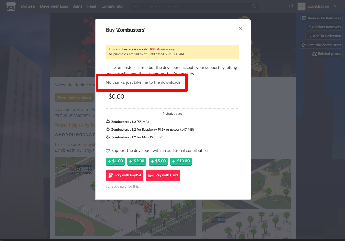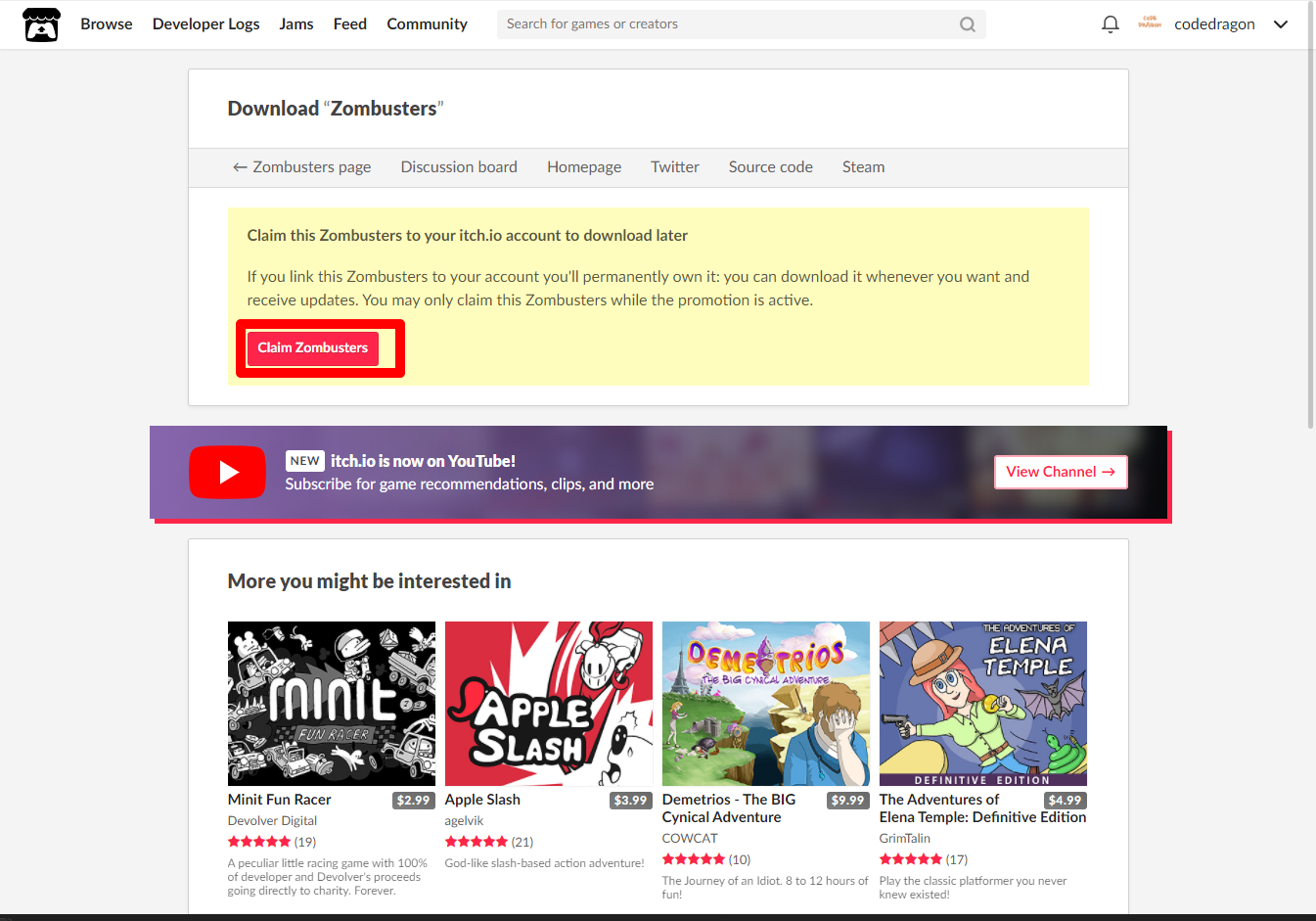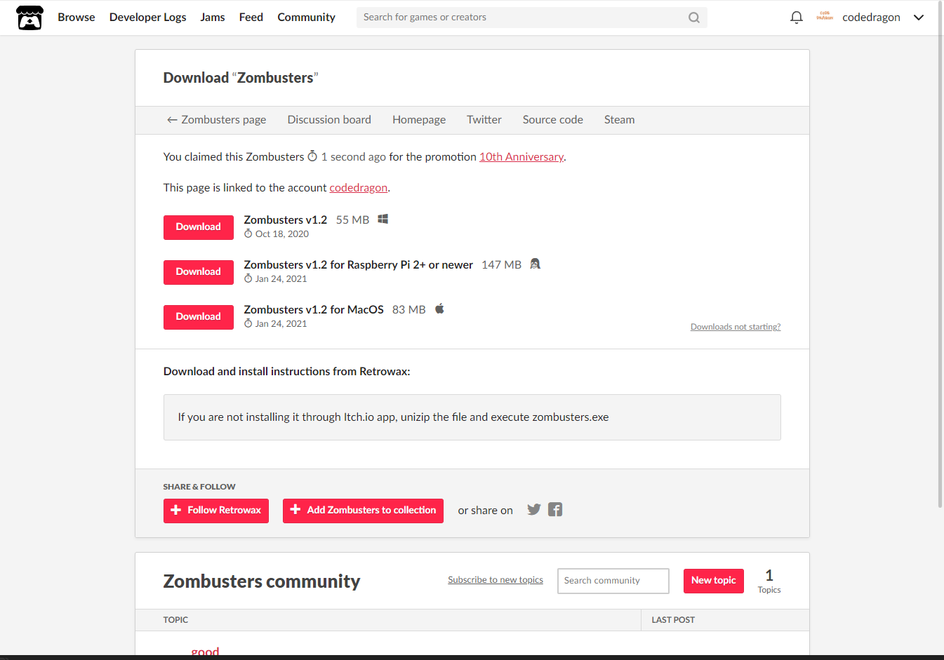 [Claim Zombusters]을 클릭하면 나의 게임 라이브러리에 추가되고 설치파일을 다운받을 수 있는 페이지로 이동됩니다.