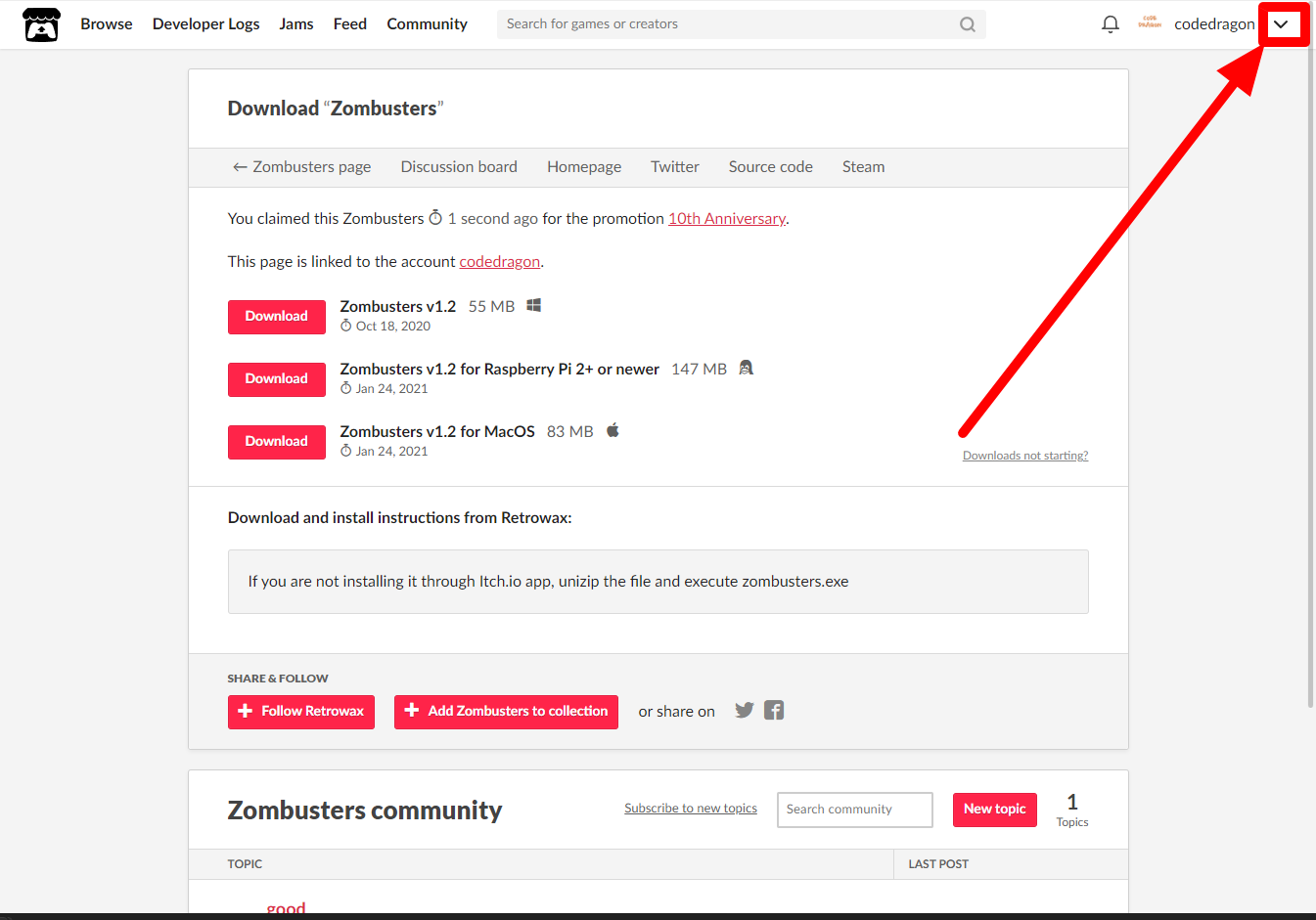[Claim Zombusters]을 클릭하면 나의 게임 라이브러리에 추가되고 설치파일을 다운받을 수 있는 페이지로 이동됩니다.