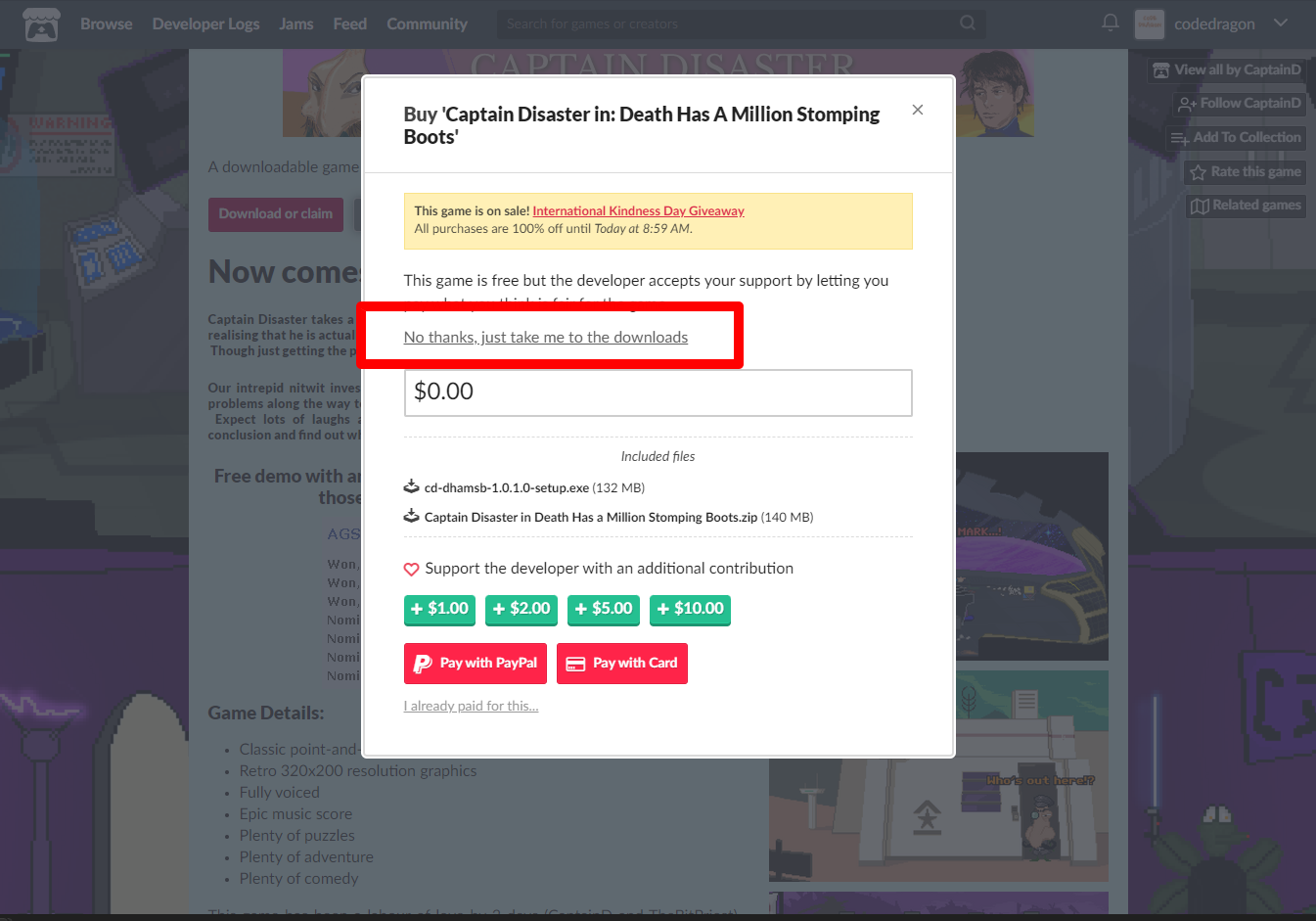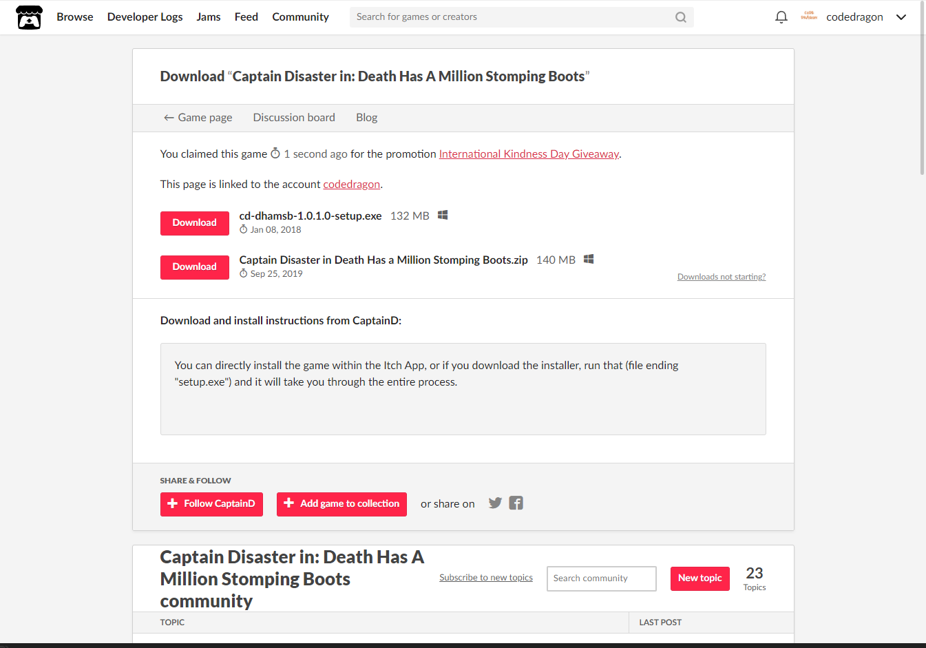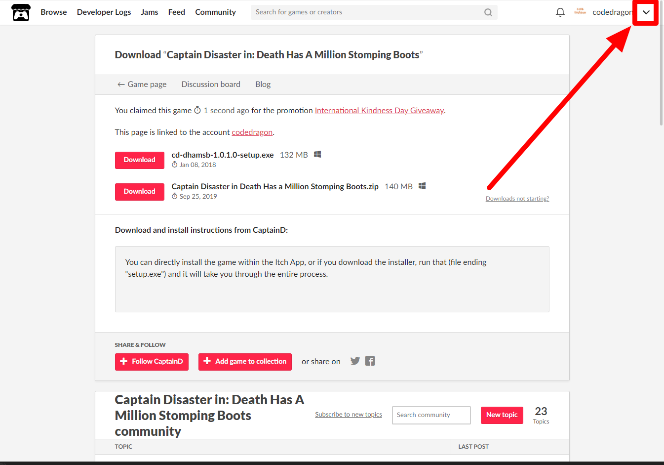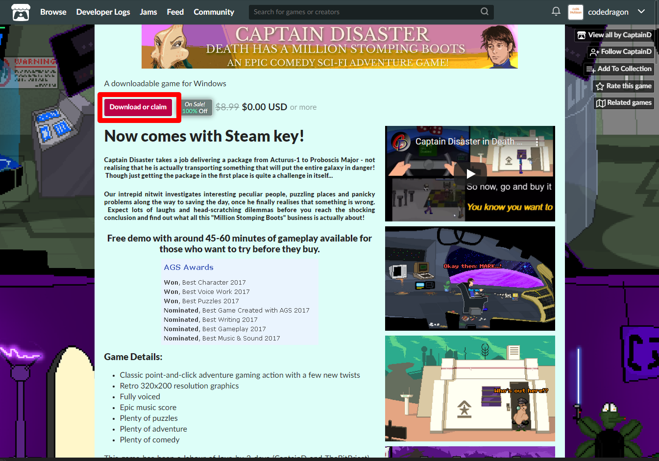 "Captain Disaster in: Death Has A Million Stomping Boots" 해당 항목에 있는 [Download] 버튼을 클릭하면 게임의 설치파일을 다운받을 수 있습니다.