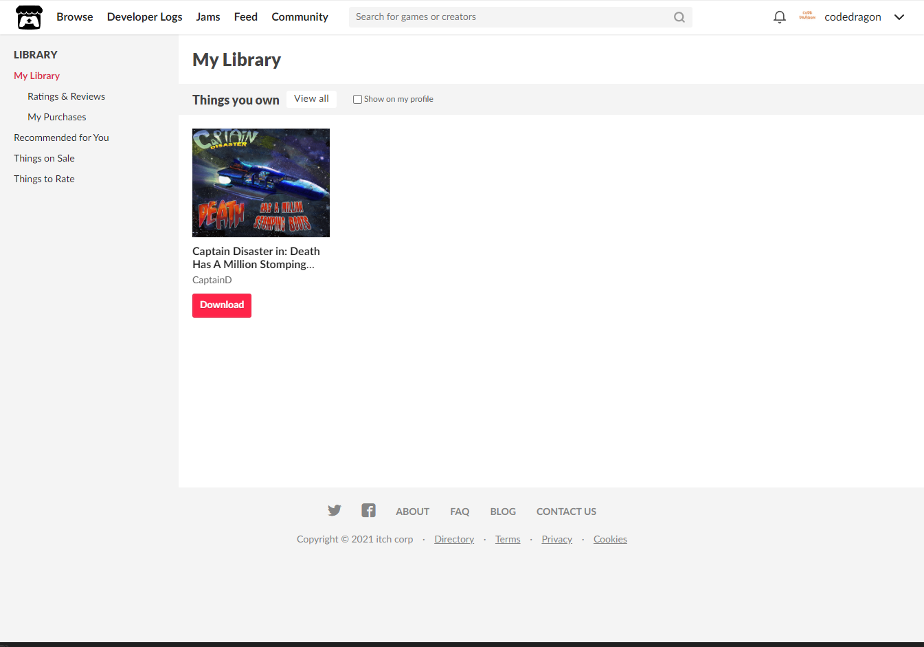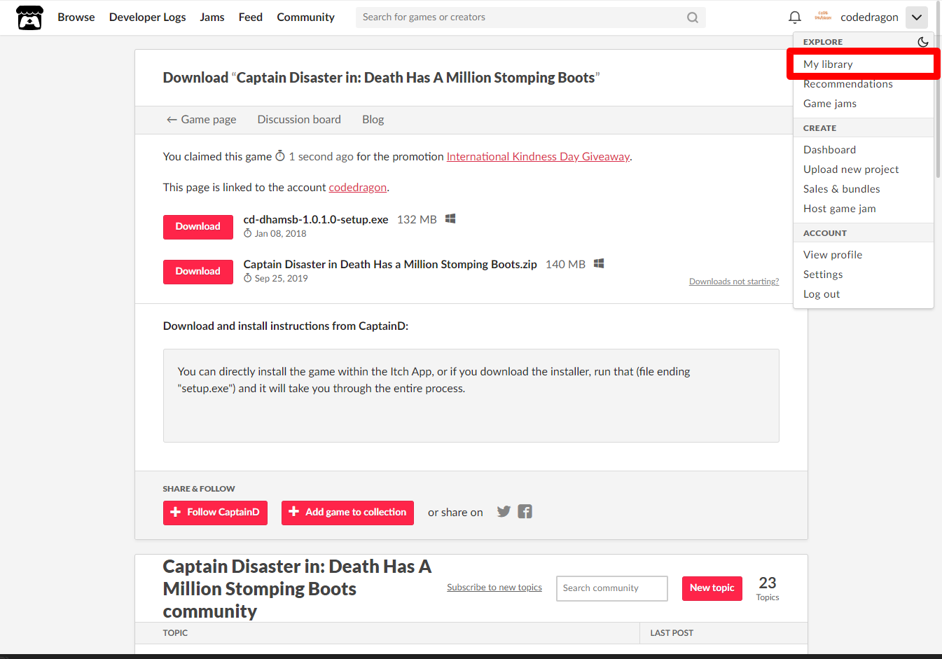 "My Lirary"에서 방금 받은 "Captain Disaster in: Death Has A Million Stomping Boots" 게임 항목을 확인할 수 있습니다.