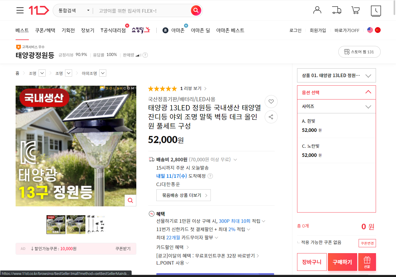 태양광 13LED 정원등 국내생산 태양열 잔디등 야외 조명 말뚝 벽등 데크 올인원 풀세트 구성 - All in one