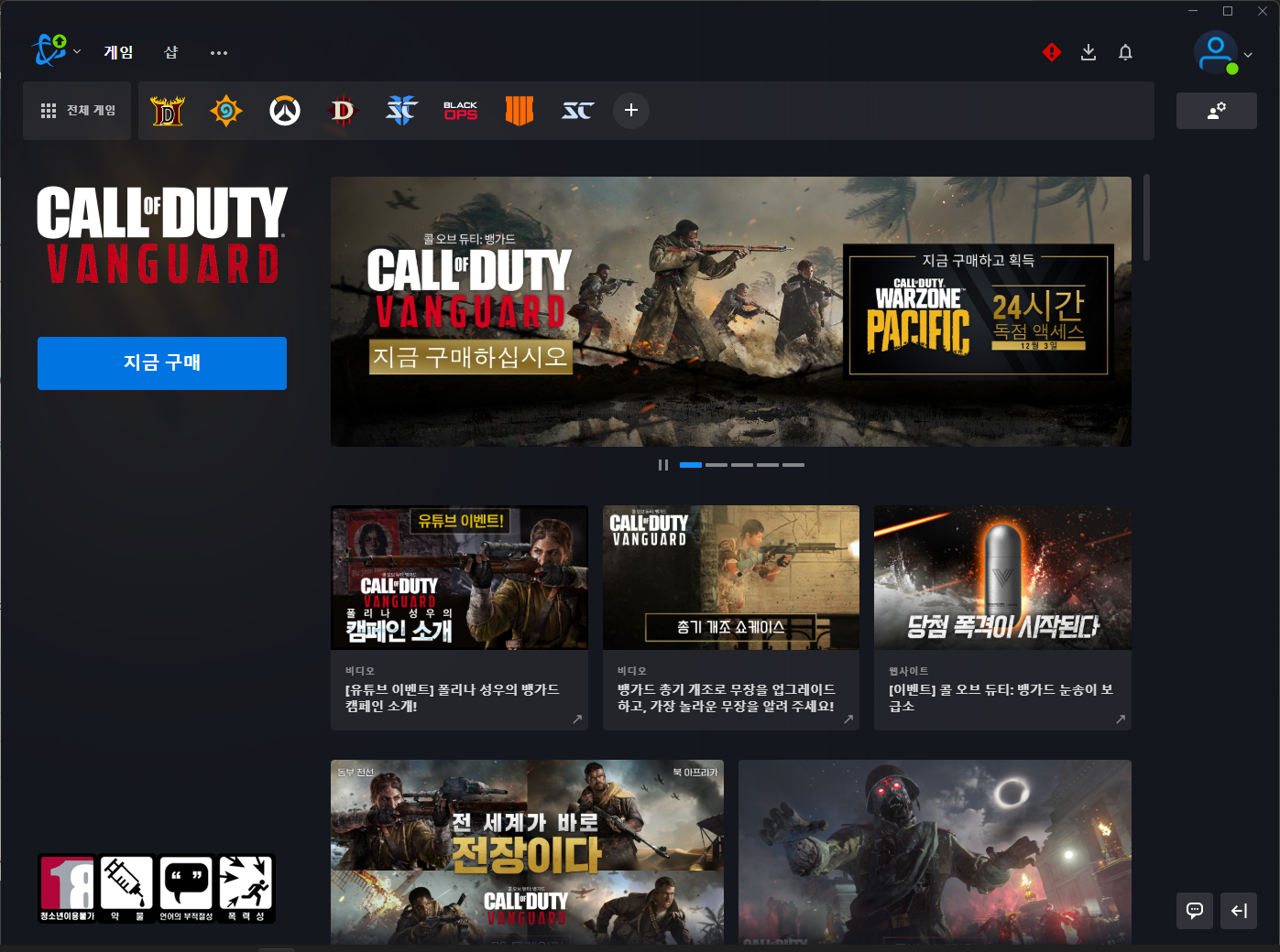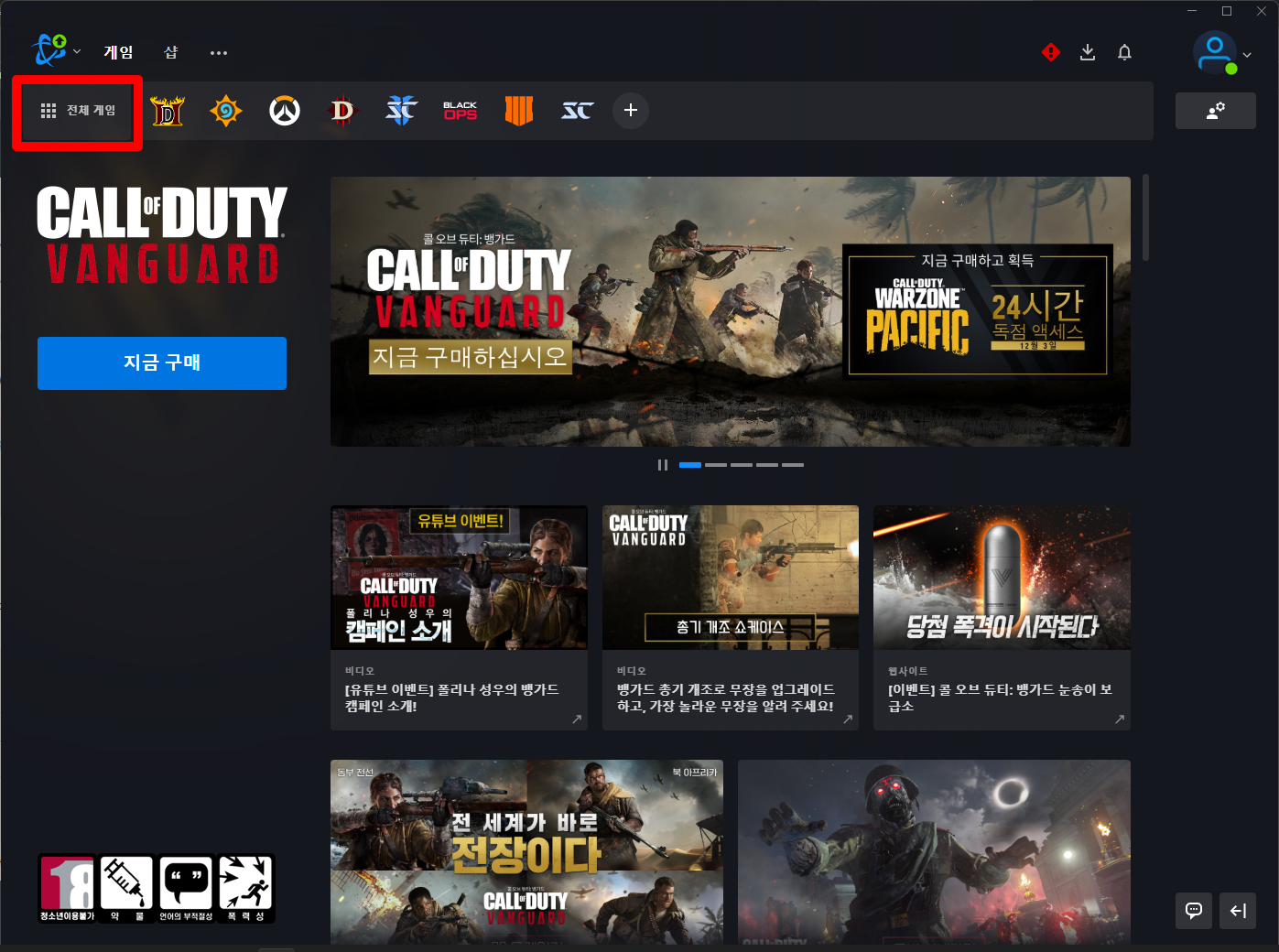 "Call of Duty: Vanguard" 게임페이지로 이동하기 위해 상단메뉴에서 [전체 게임] 클릭합니다