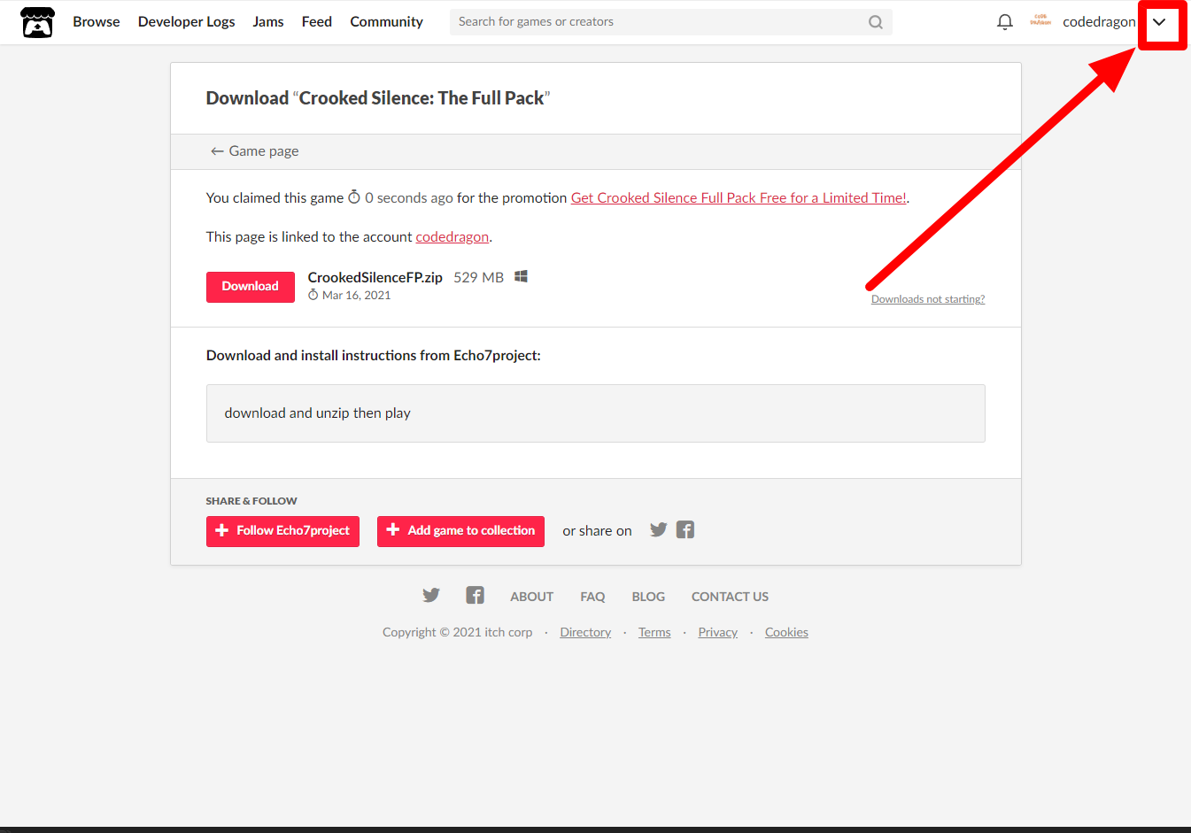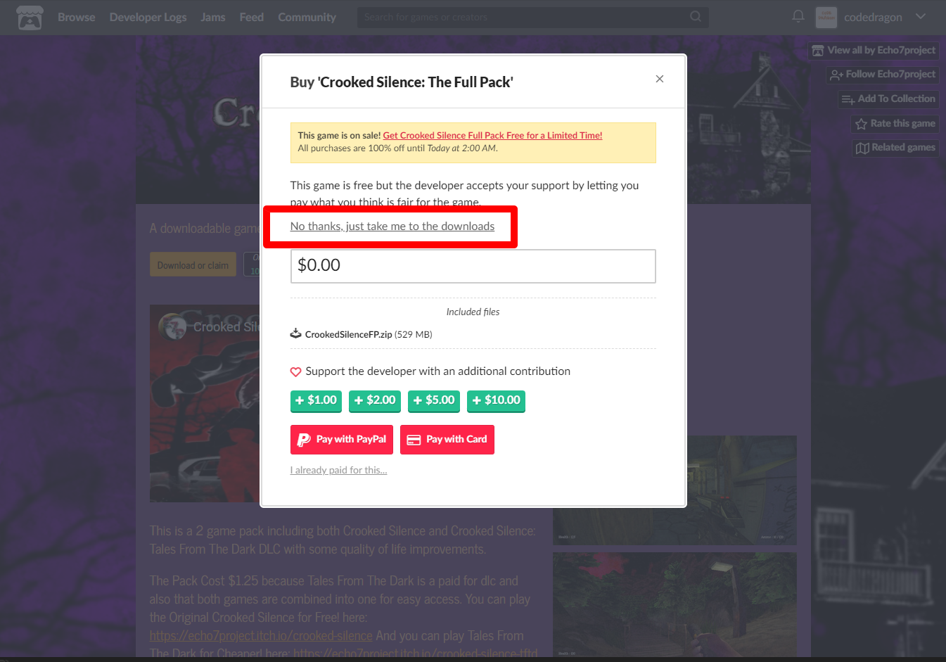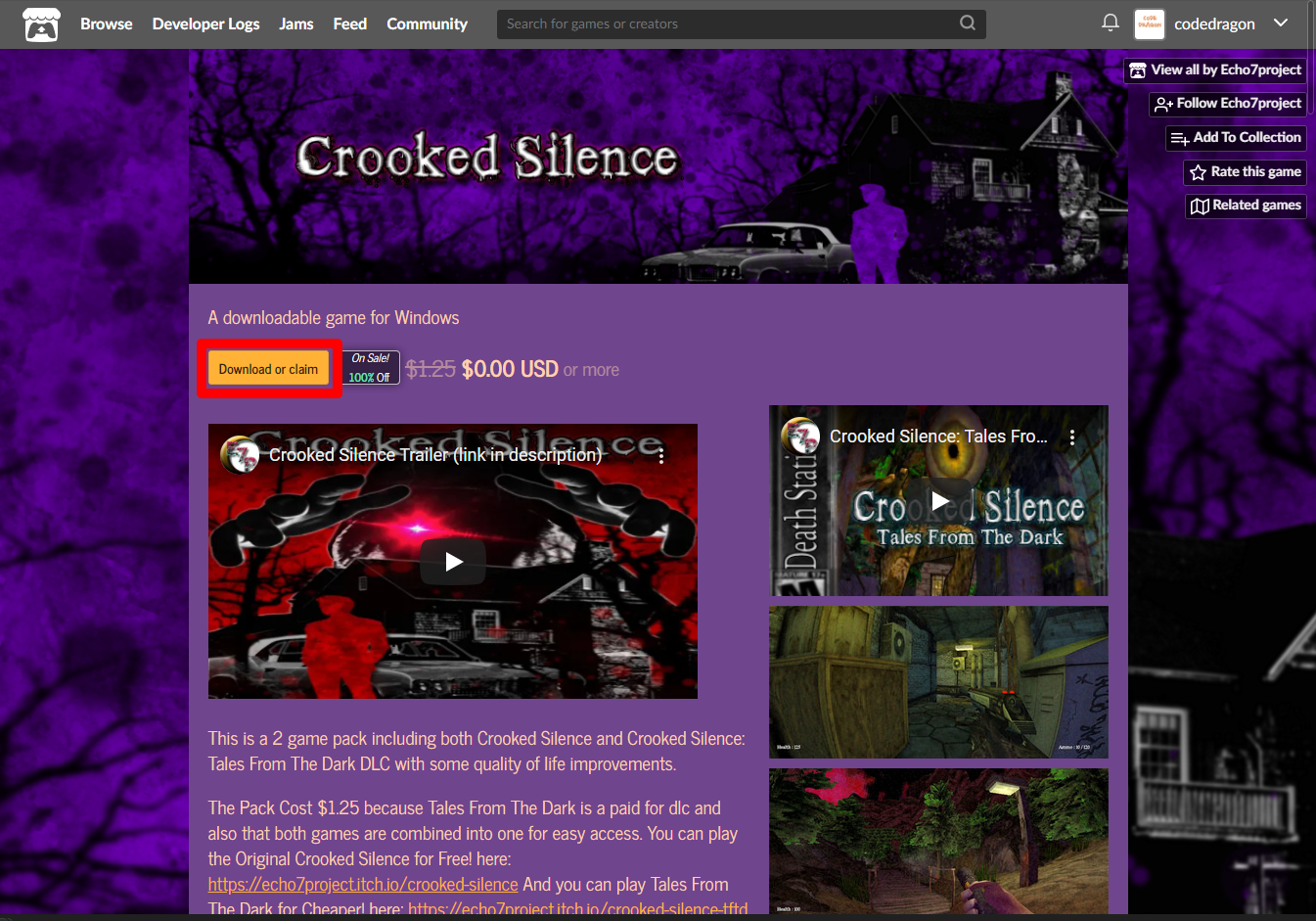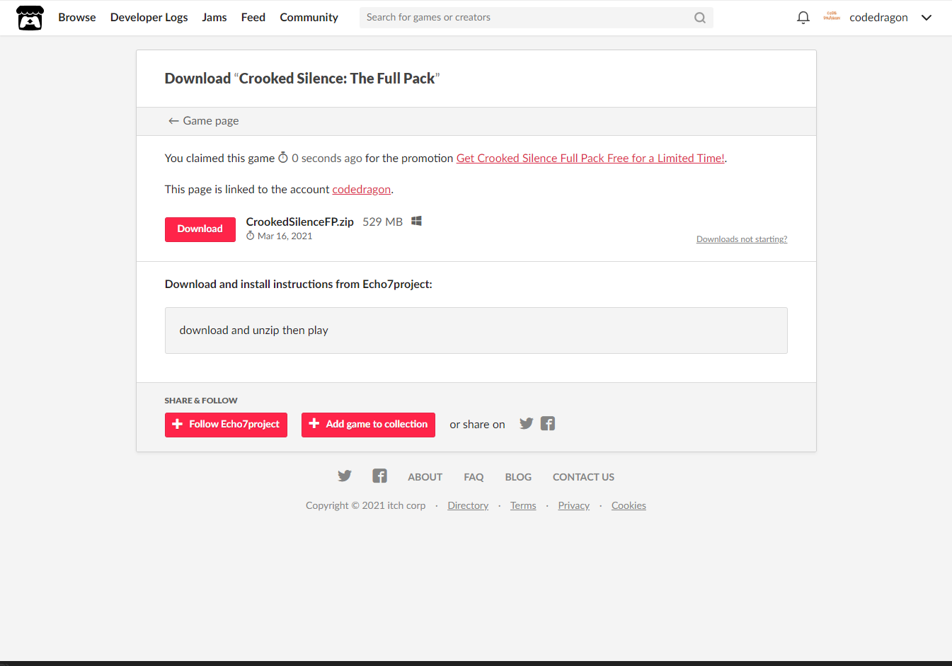 "Crooked Silence: The Full Pack" 해당 항목에 있는 [Download] 버튼을 클릭하면 게임의 설치파일을 다운받을 수 있습니다.