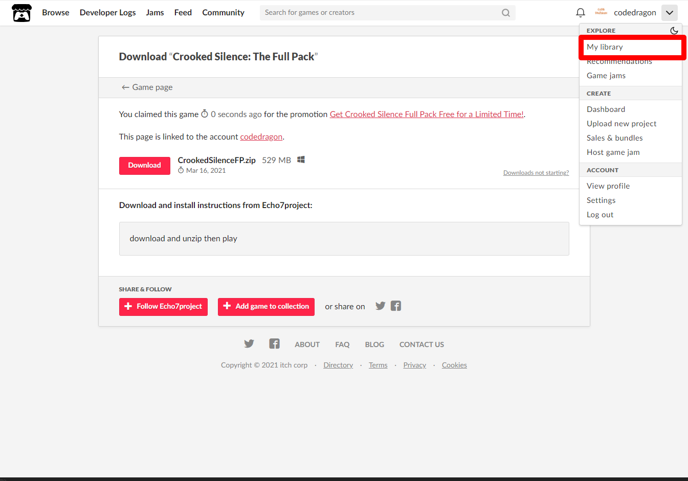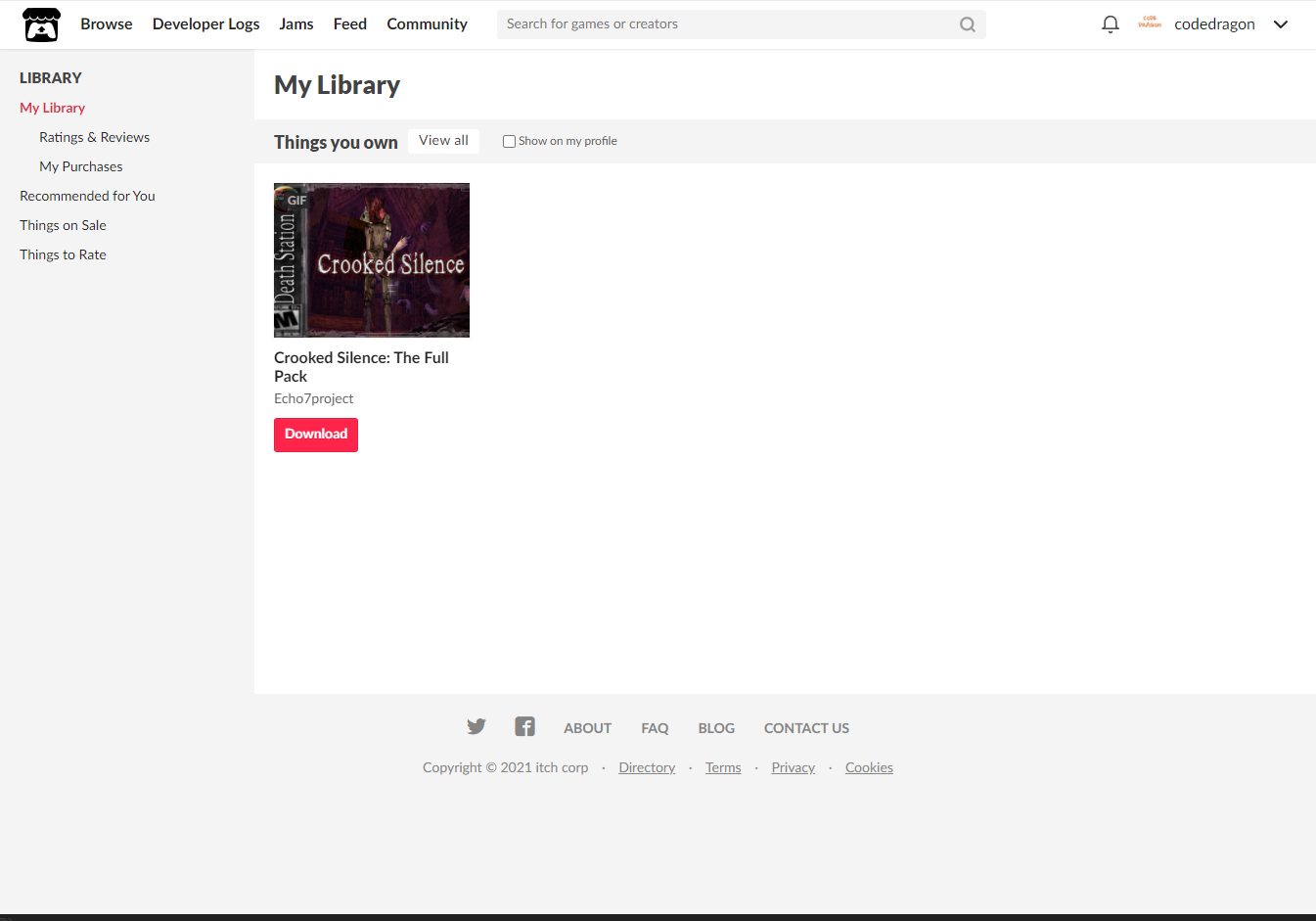 "My Lirary"에서 방금 받은 "Crooked Silence: The Full Pack" 게임 항목을 확인할 수 있습니다.