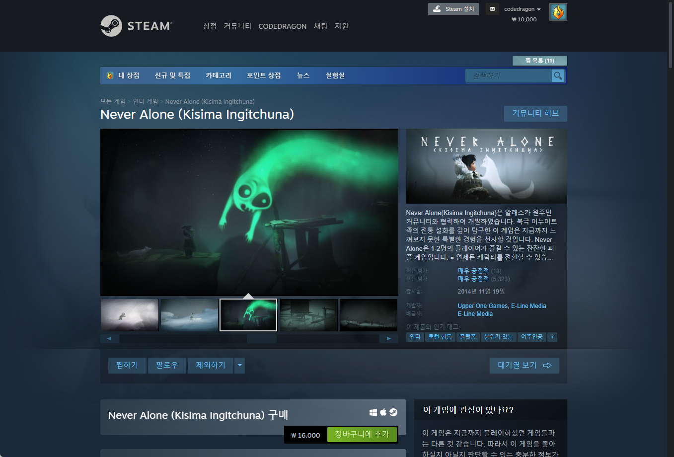 ₩15,000 -> ₩0(FREE) Never Alone (Kisima Ingitchuna) 네버 얼론 키시마 잉기추나 무료로 받기 영구소장; 에픽 게임즈 epic games 한시적 무료 Get free copy 2023 EGS