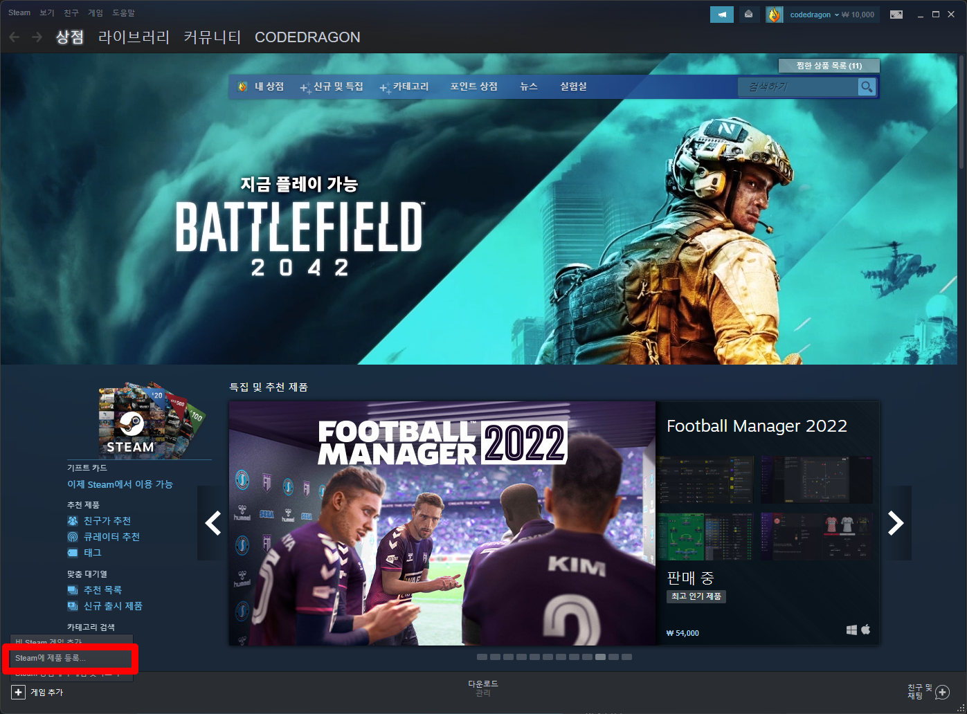 나오는 메뉴에서 [Steam에 제품 등록]을 클릭합니다.