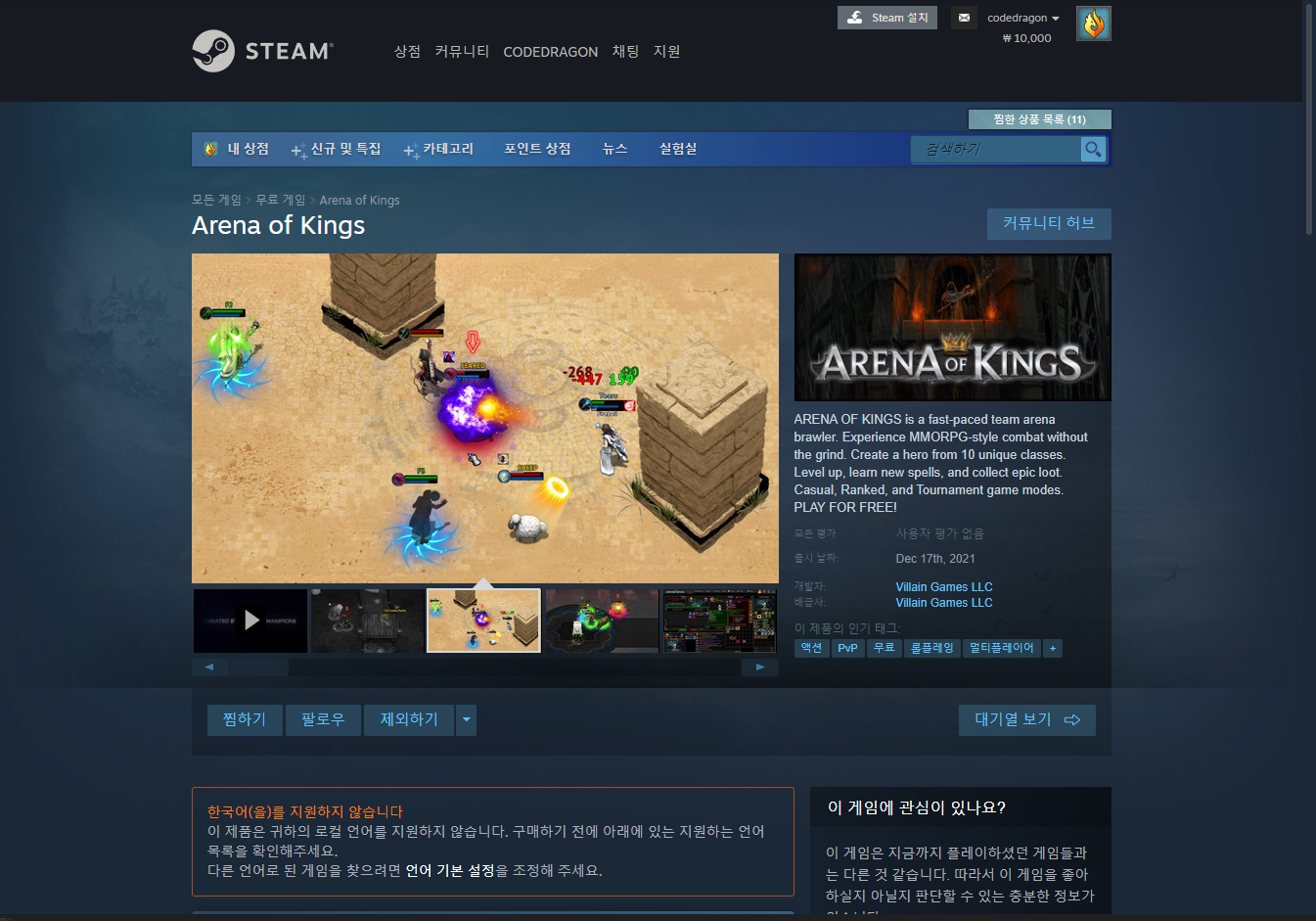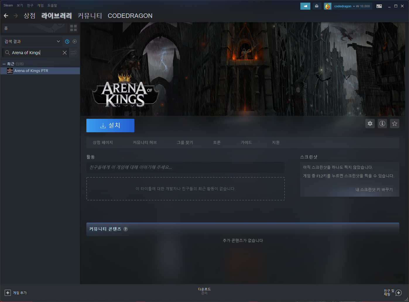 나의 게임 라이브러리에서 등록한 "Arena of Kings" 항목을 확인할 수 있습니다