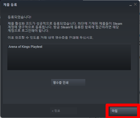 "Arena of Kings" 게임명이 표시되고 등록이 완료됩니다.