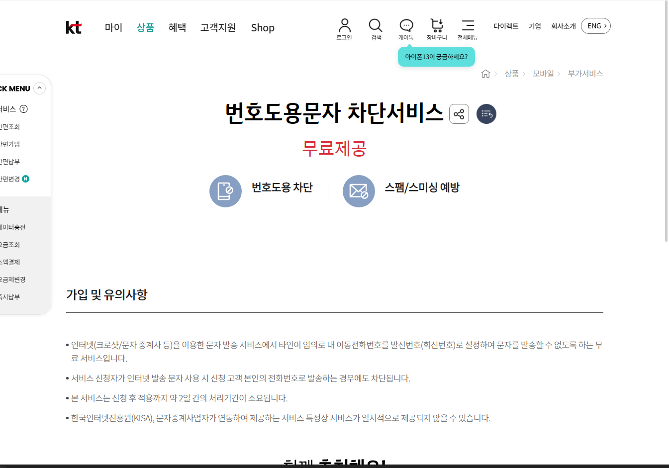 번호도용문자차단 서비스 - SK, KT, LG, 홈페이지 URL, 고객센터 번화번호