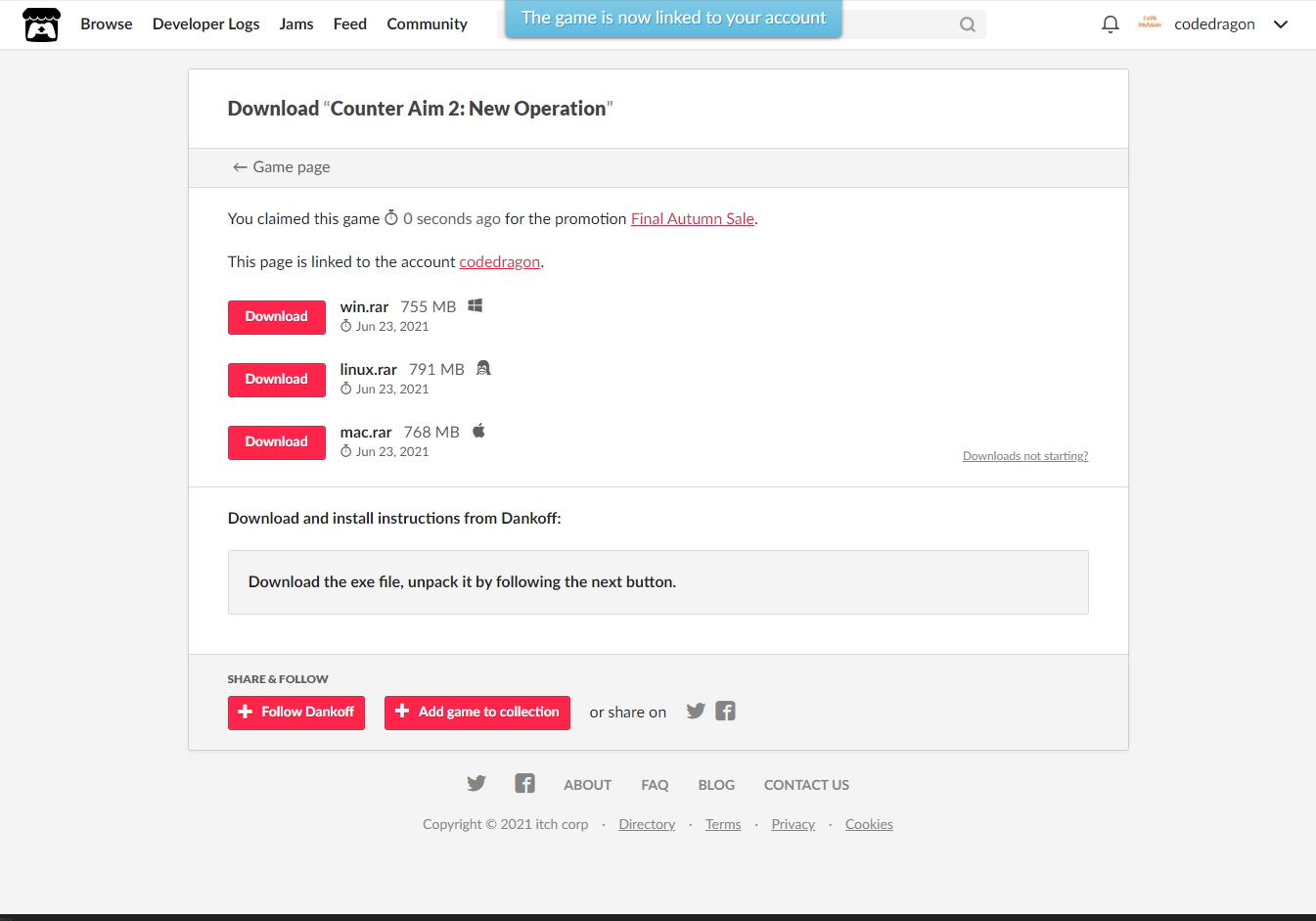 [Claim game]을 클릭하면 나의 게임 라이브러리에 추가되고 설치파일을 다운받을 수 있는 페이지로 이동됩니다.