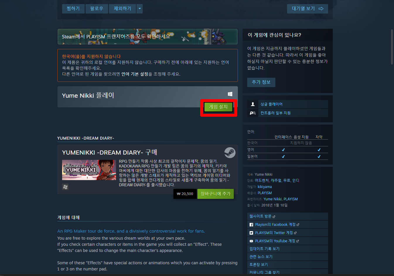 "Yume Nikki" 페이지를 내려 [게임 설치]를 클릭하면 됩니다.