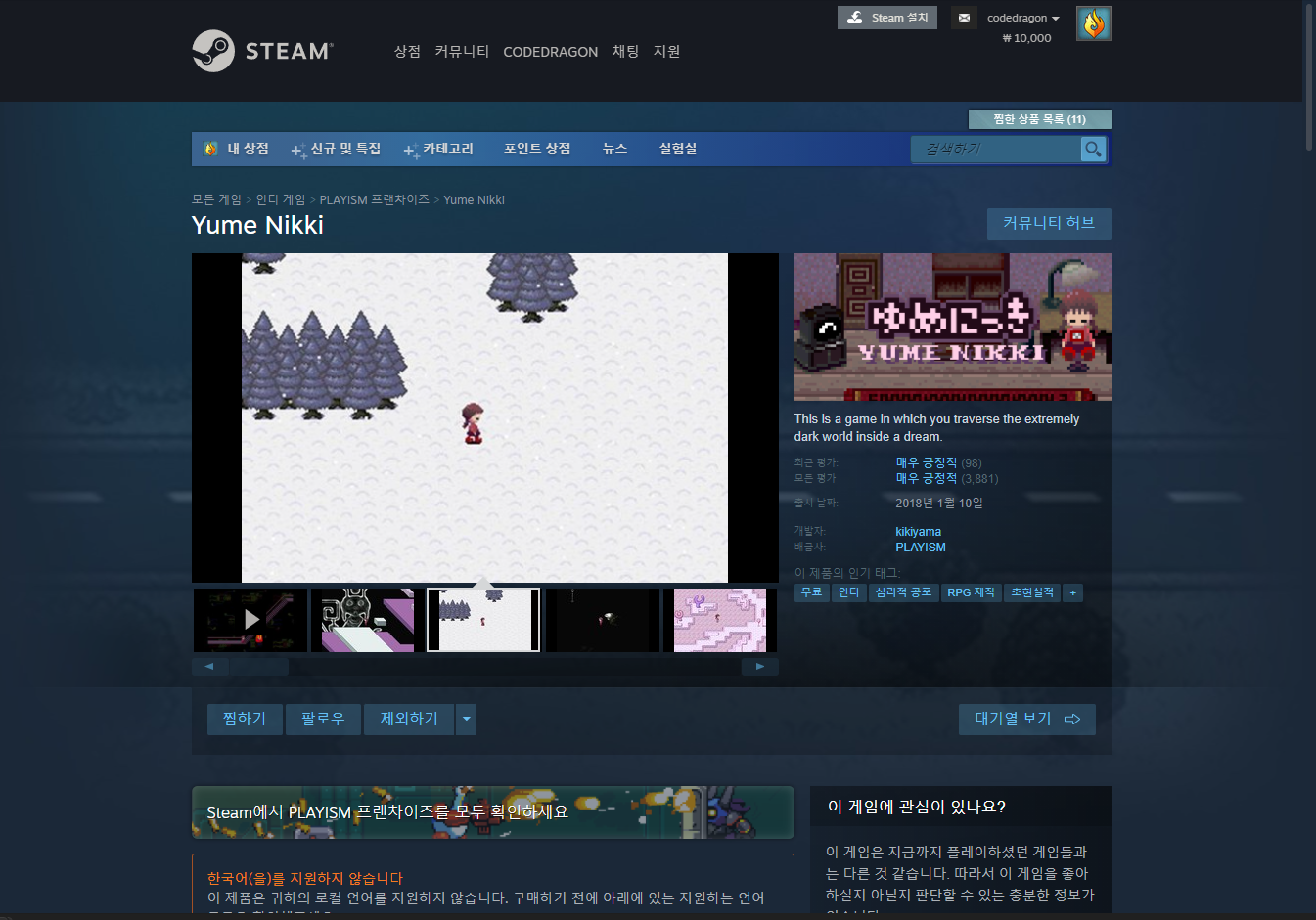 "Yume Nikki" 스팀 페이지 입니다.