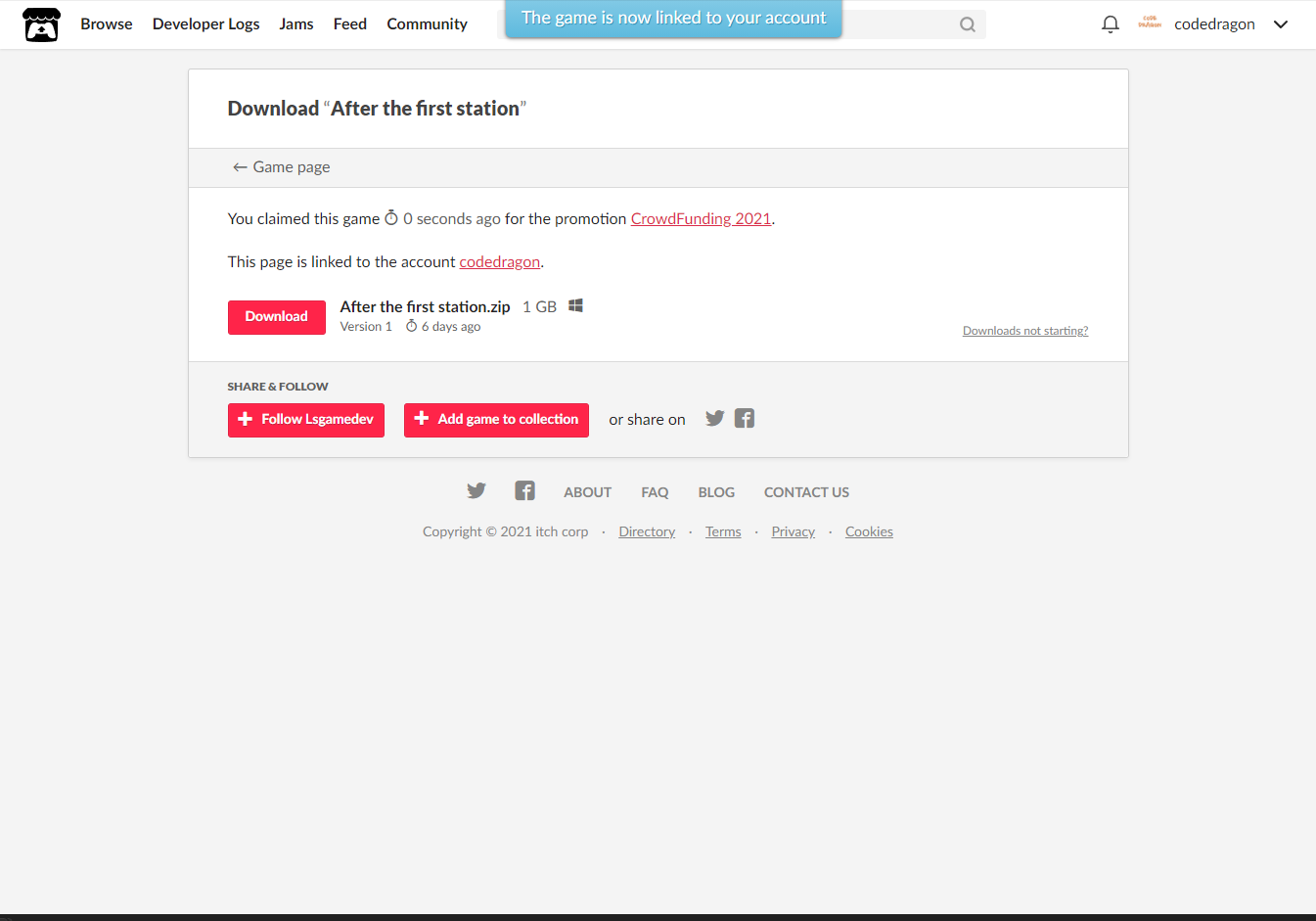 [Claim game]을 클릭하면 나의 게임 라이브러리에 추가되고 설치파일을 다운받을 수 있는 페이지로 이동됩니다.