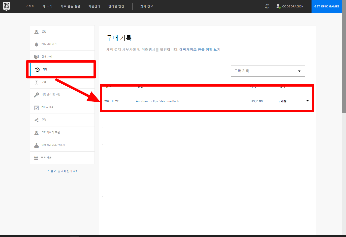 에픽게임즈 계정 페이지 왼쪽의 [거래] 메뉴를 클릭하면 구매한 게임을 확인할 수 있습니다.