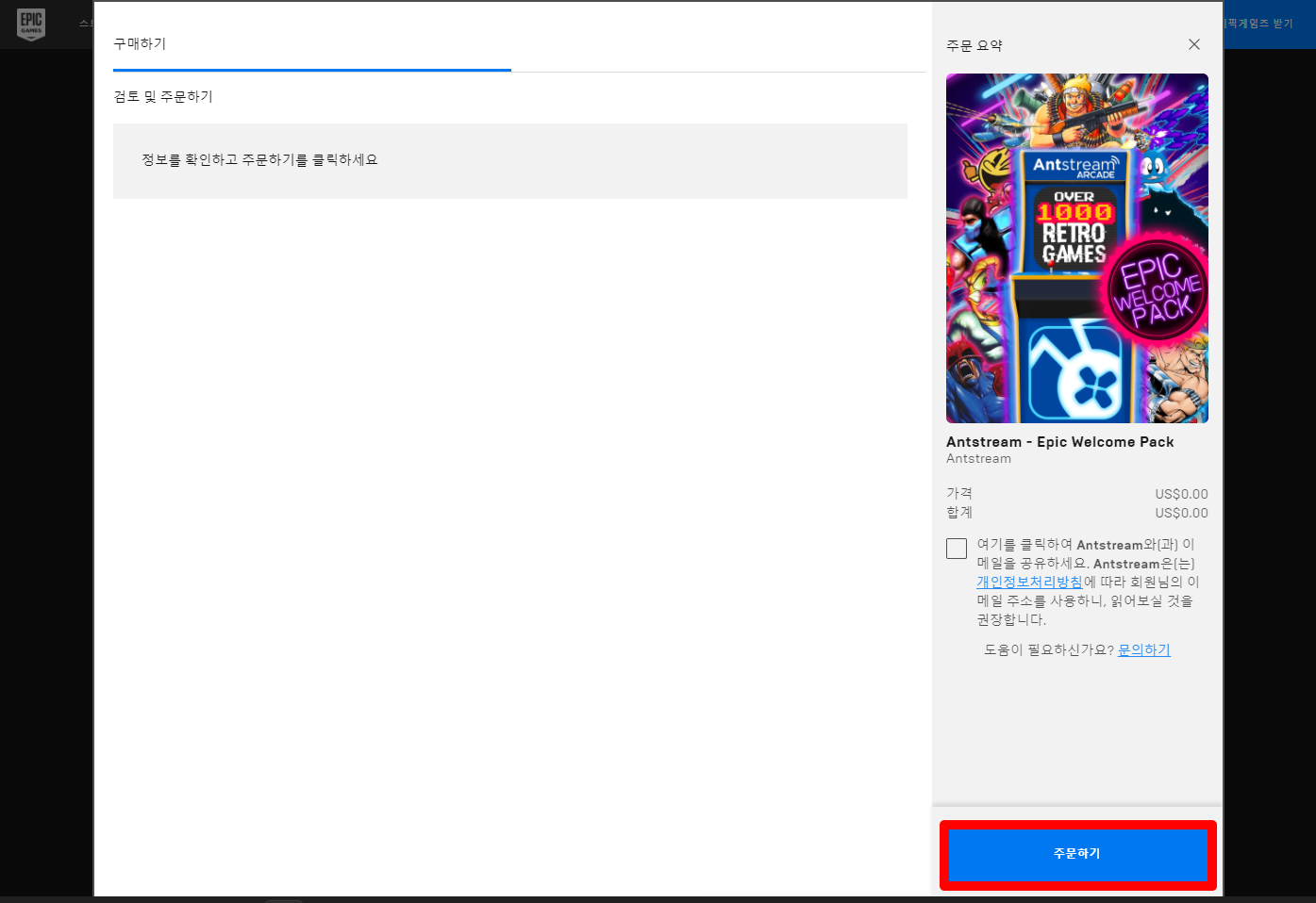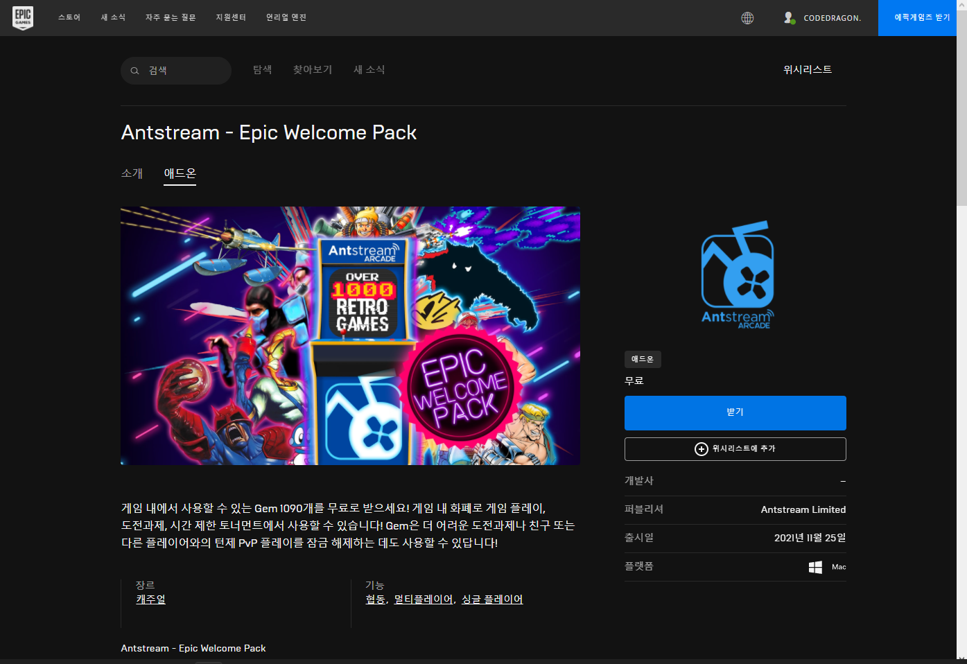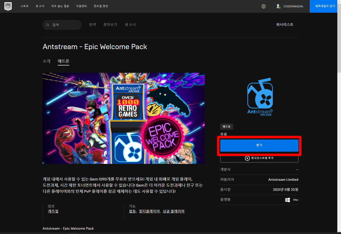 다시 "Antstream - Epic Welcome Pack" 게임페이지에 접속하겠습니다.