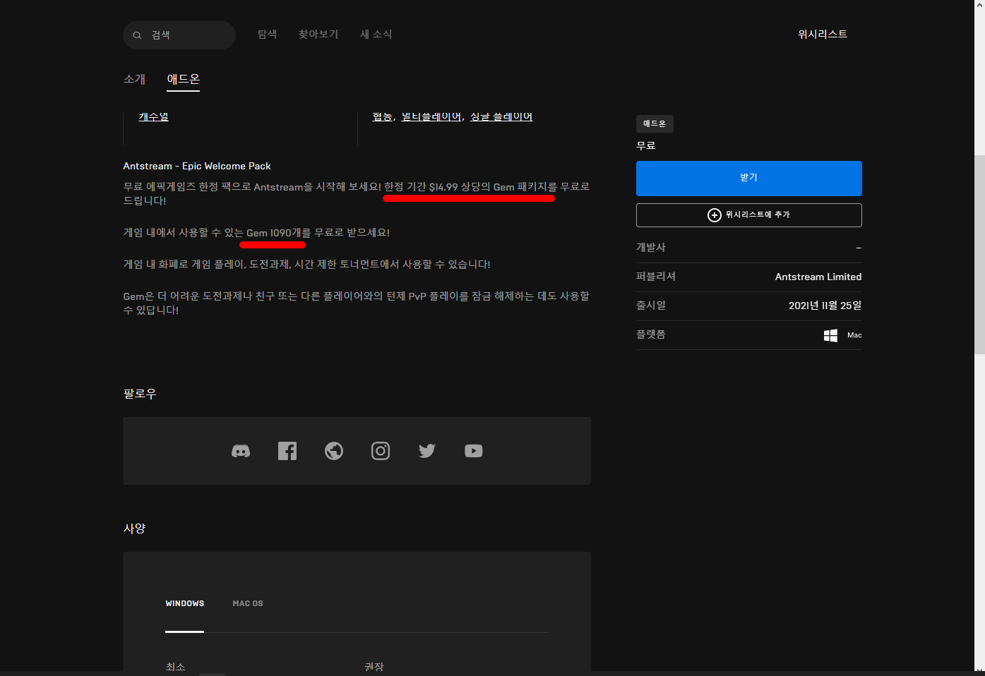 "Antstream - Epic Welcome Pack"게임 정보 페이지에 접속하면 한국에서는 해당 게임이 스토어에 정상적으로 등록된 상태가 아니라서 접속할 수 없습니다.