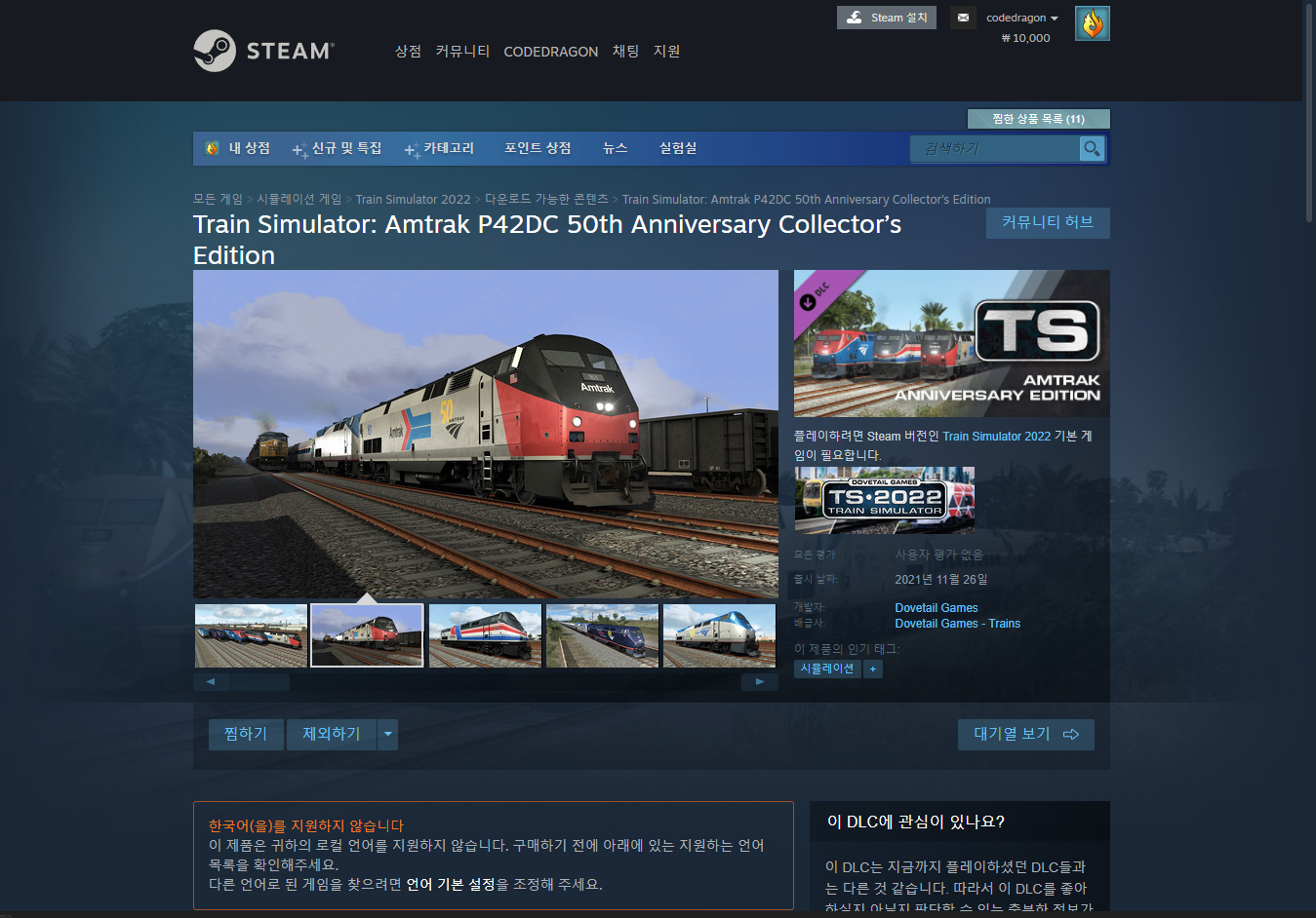 "Train Simulator: Amtrak P42DC 50th Anniversary Collector’s Edition" 해당 DLC를 받기 위해서는 베이스게임(Train Simulator 2022)을 보유하고 있거나 구매해야 합니다.