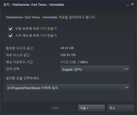 제품설치창이 오픈되면 원하는 위치에 "Warhammer: End Times - Vermintide"를 설치해 줍니다.