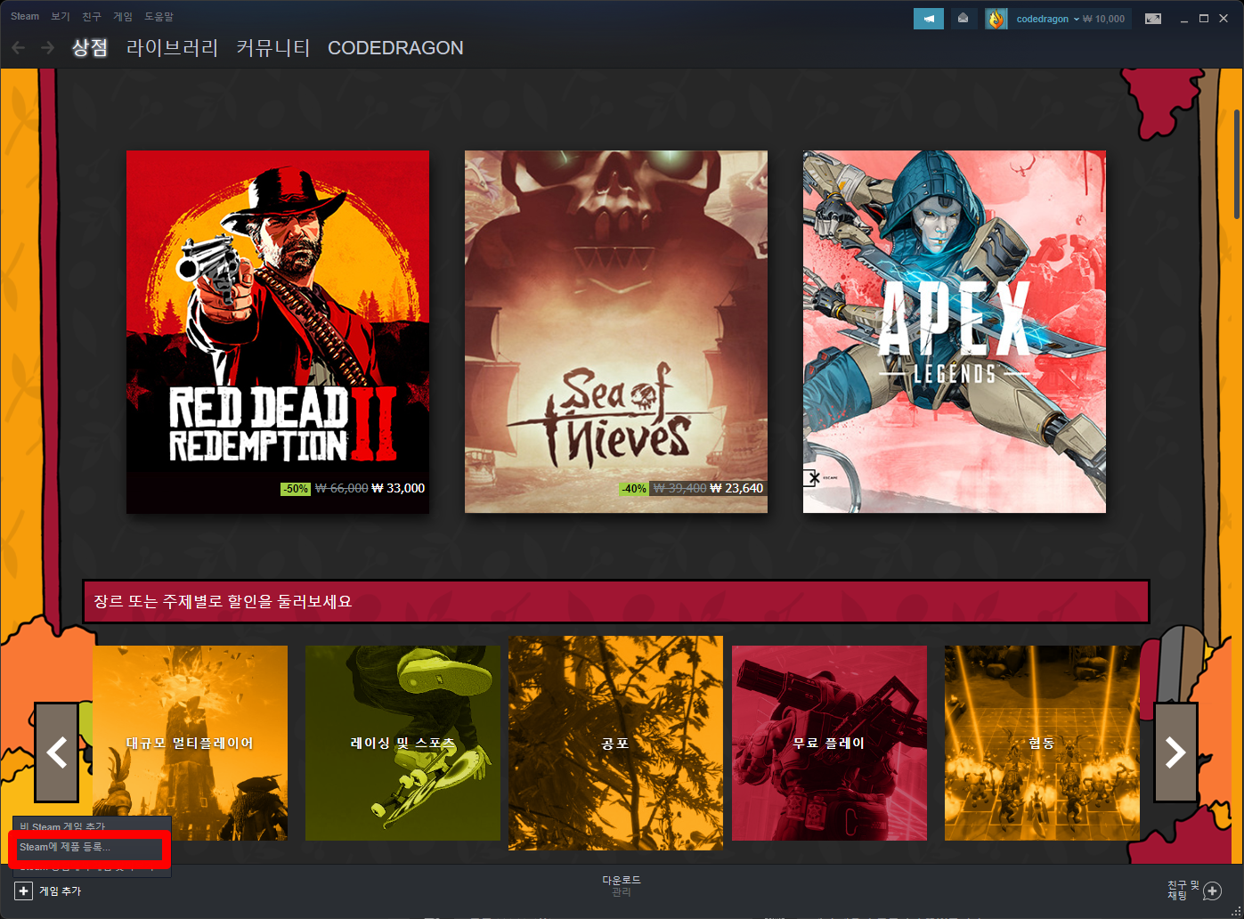 나오는 메뉴에서 [Steam에 제품 등록]을 클릭합니다.