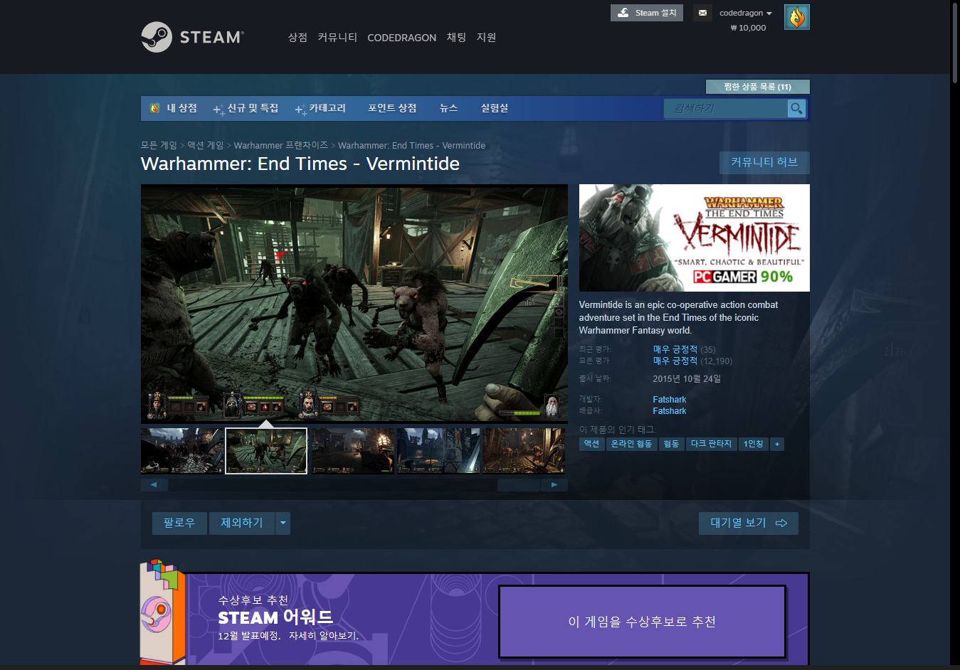 "Warhammer: End Times - Vermintide" 게임 페이지입니다.