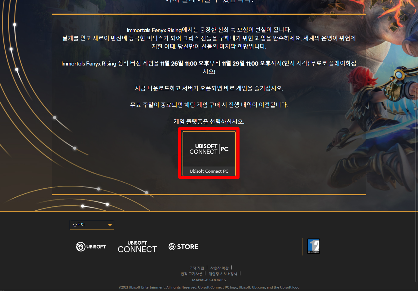 "Immortals Fenyx Rising" 게임페이지를 조금 내려서 [UBISOFT CONNECT | PC] 버튼을 클릭하면 됩니다.