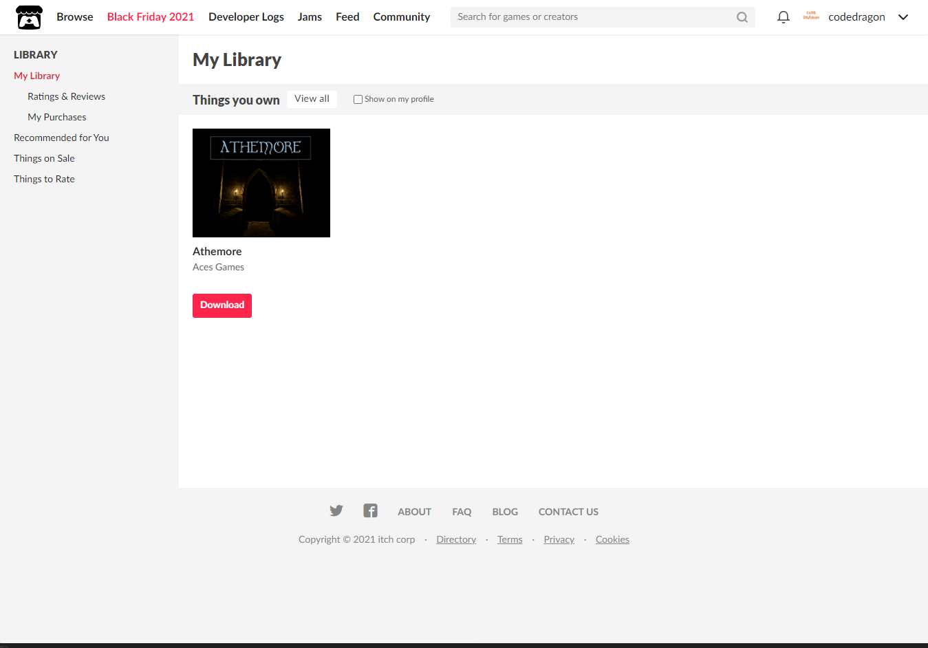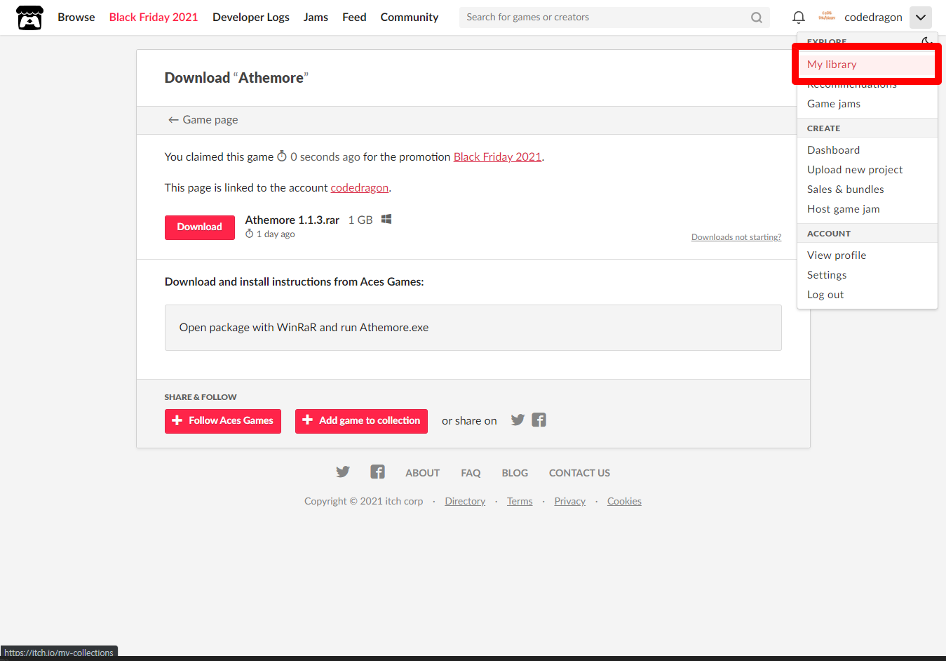 "My Lirary"에서 방금 받은 "Athemore" 게임 항목을 확인할 수 있습니다.