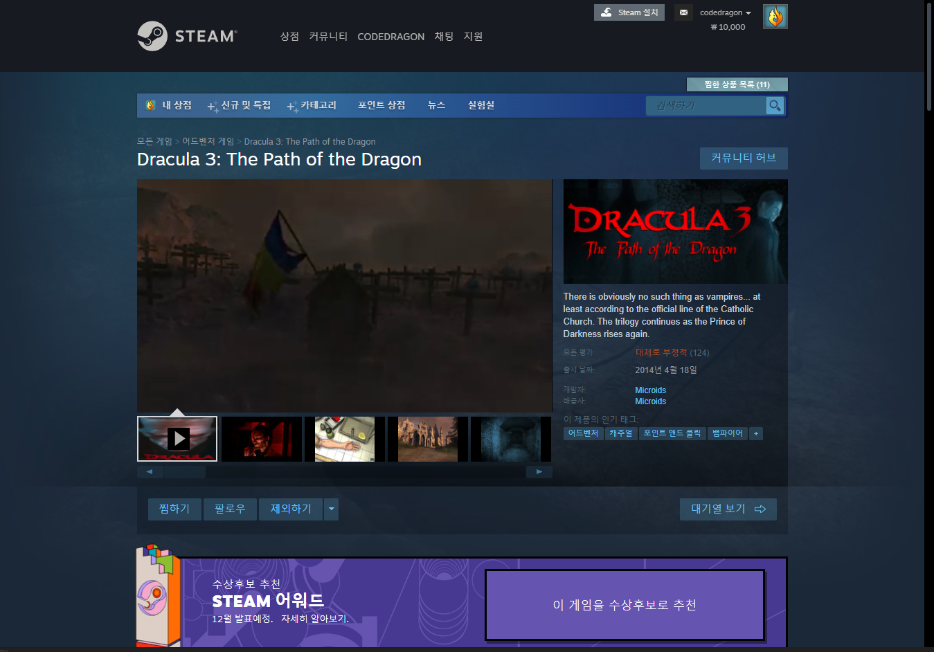 ₩8,500 -> ₩ 0(Free) Dracula 3: The Path of the Dragon 드라큘라 3: 패스 오브 드래곤 무료 - 인디갈라 indiegala 무료 소장 기회 기간한정 indiegala FREE GAME, Limited time