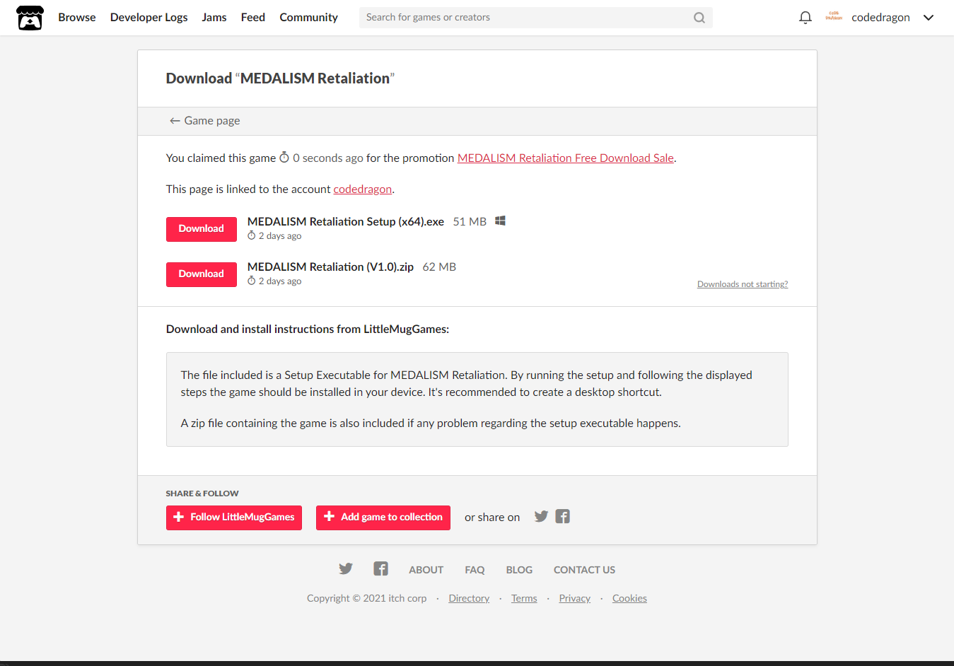 "MEDALISM Retaliation" 해당 항목에 있는 [Download] 버튼을 클릭하면 게임의 설치파일을 다운받을 수 있습니다.