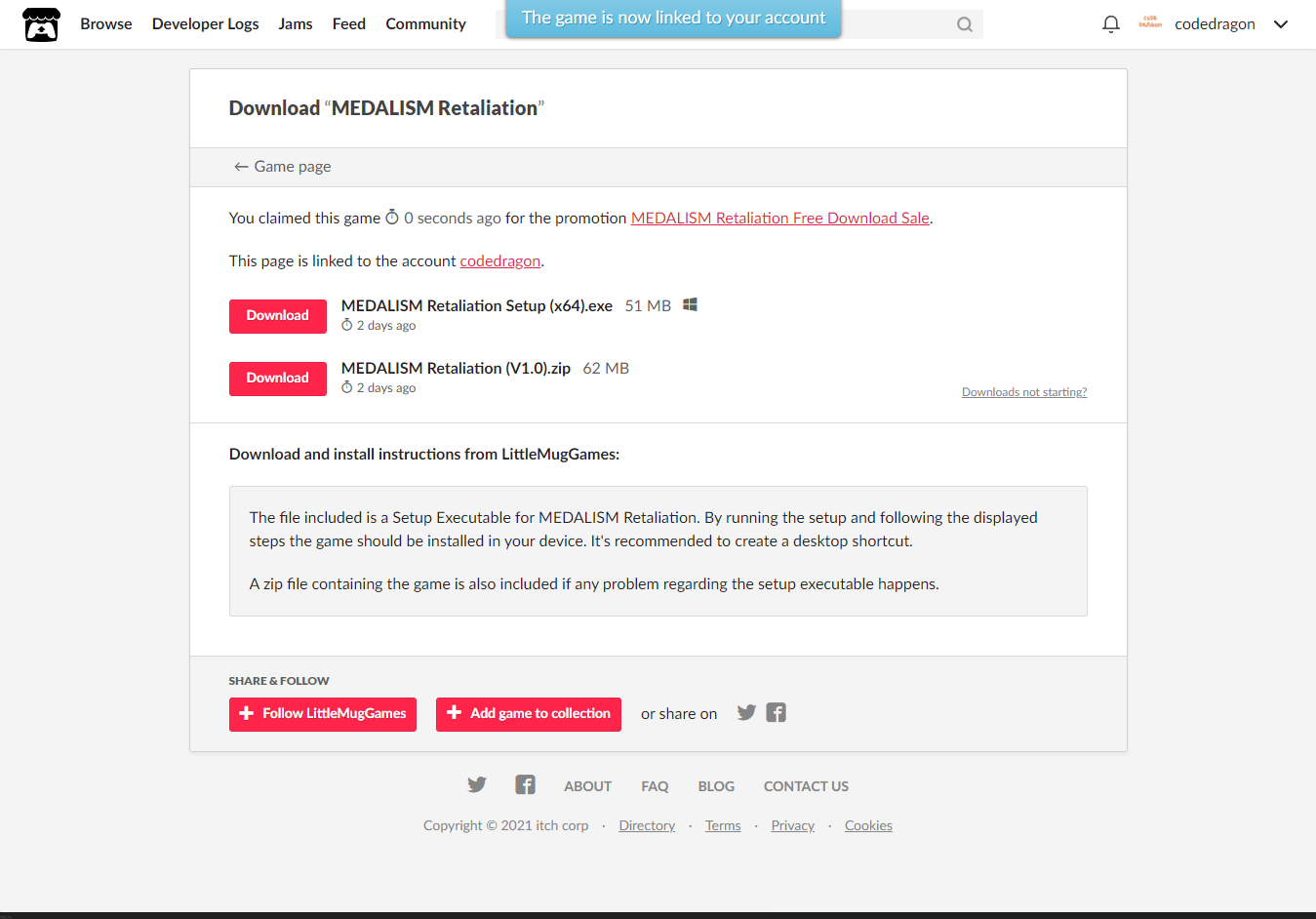 [Claim game]을 클릭하면 나의 게임 라이브러리에 추가되고 설치파일을 다운받을 수 있는 페이지로 이동됩니다.