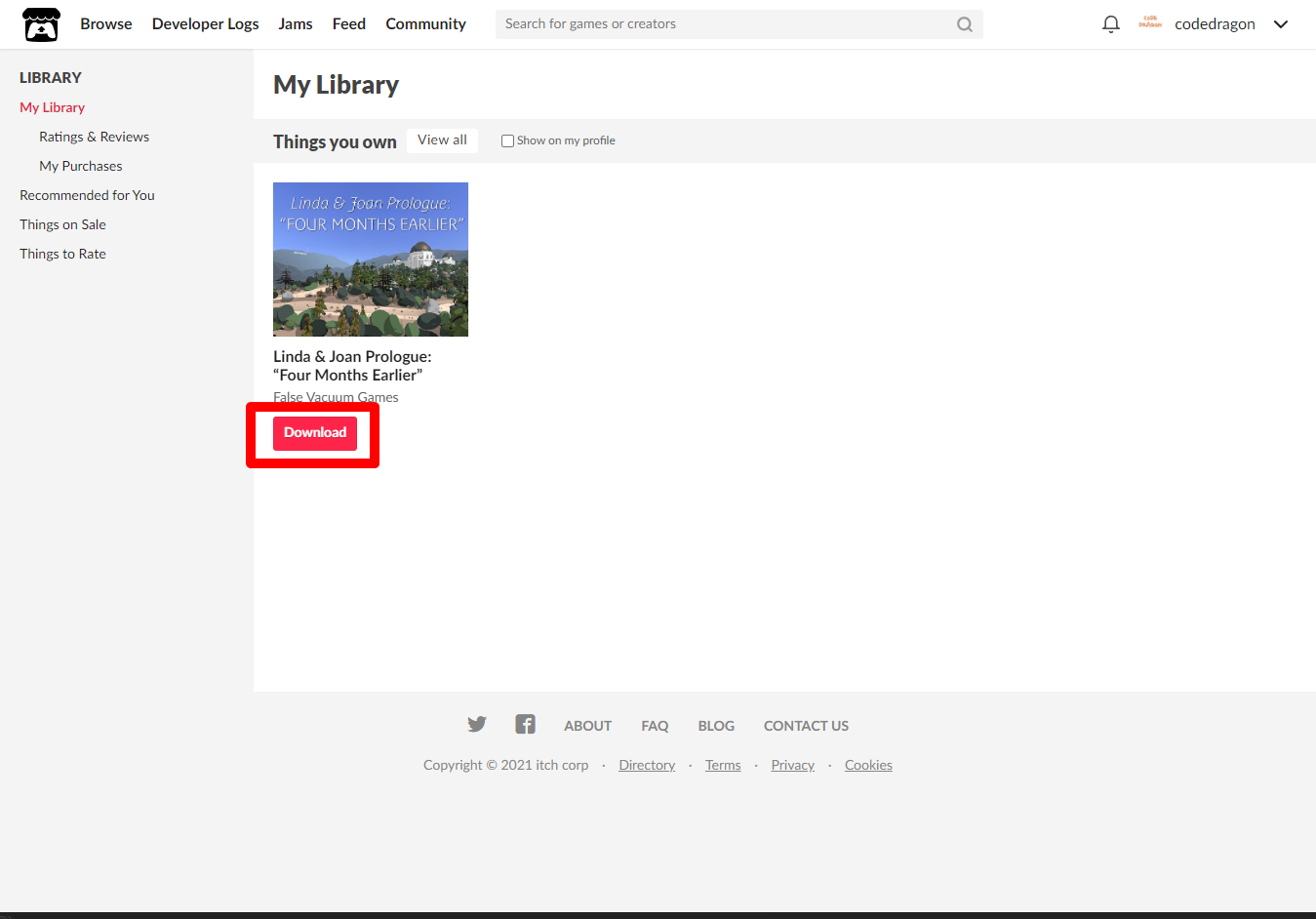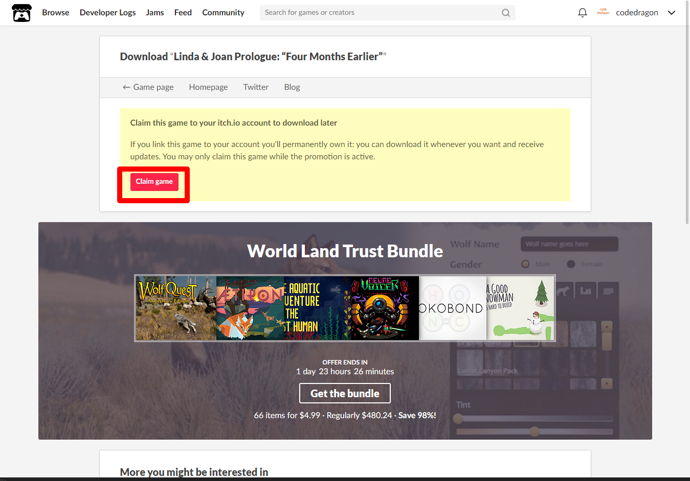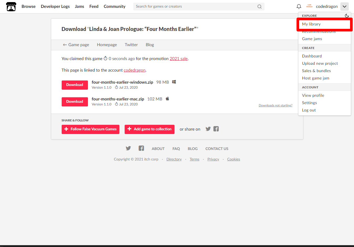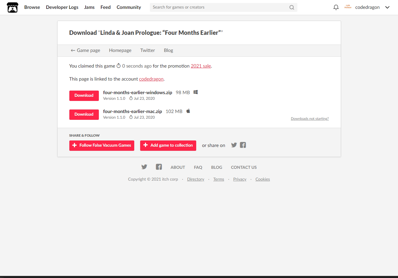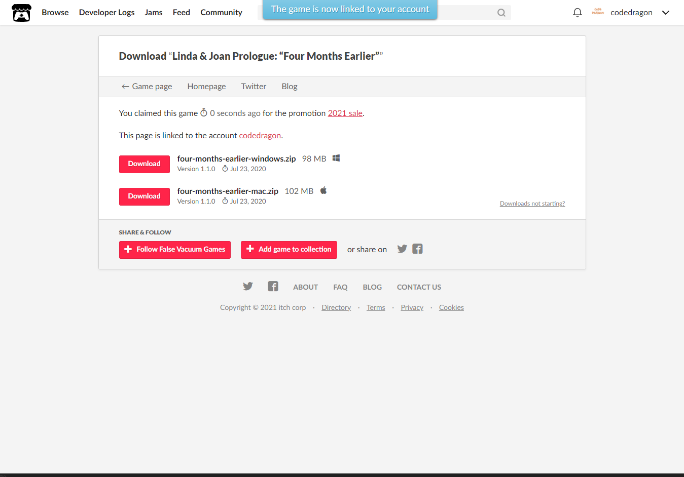 [Claim game]을 클릭하면 나의 게임 라이브러리에 추가되고 설치파일을 다운받을 수 있는 페이지로 이동됩니다.