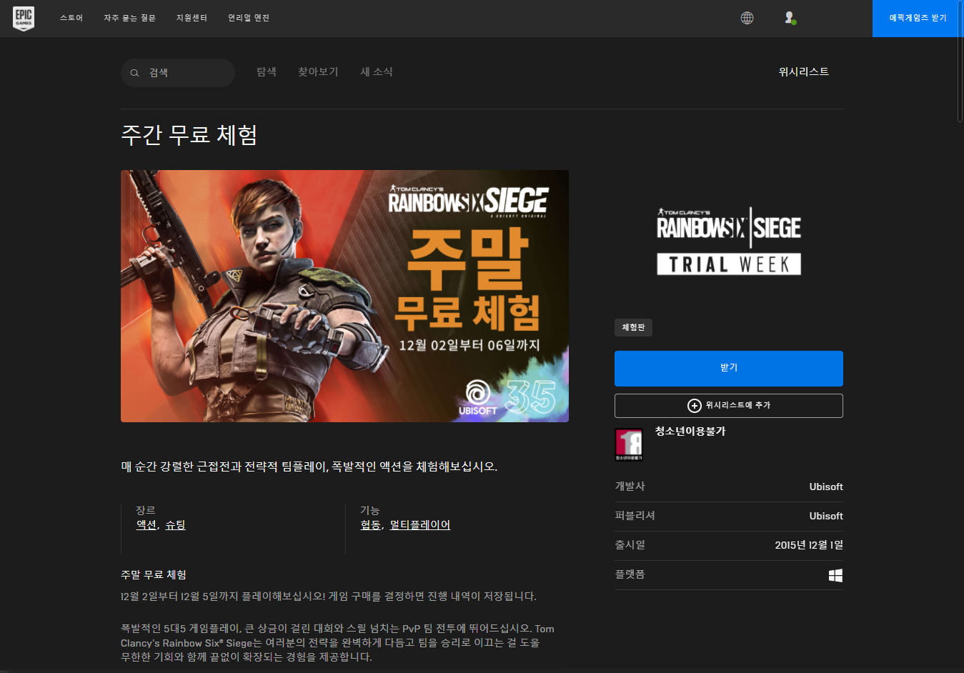 "Tom Clancy's Rainbow Six Siege" 게임 페이지 Epic 에픽