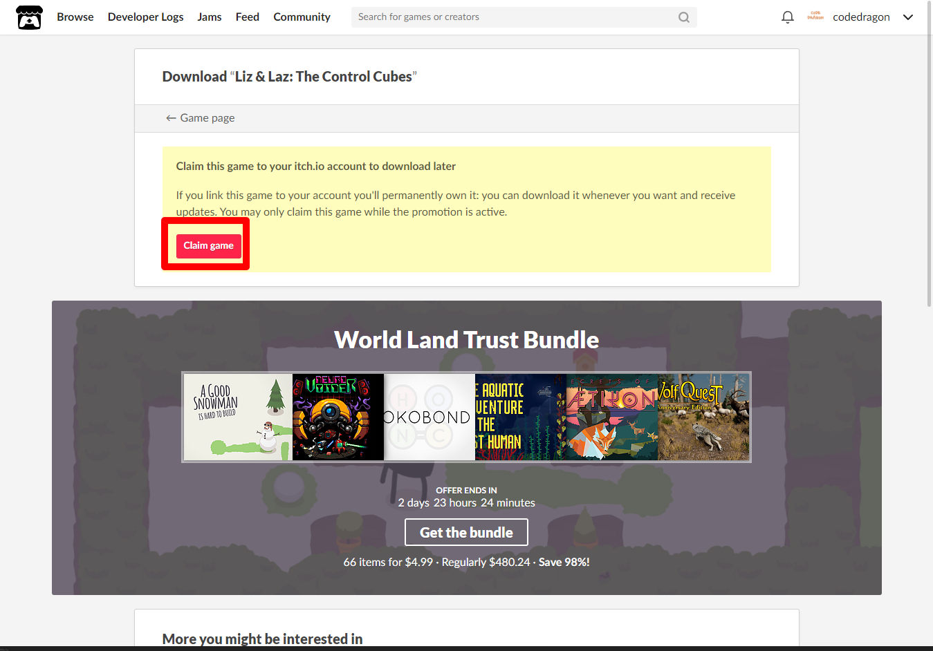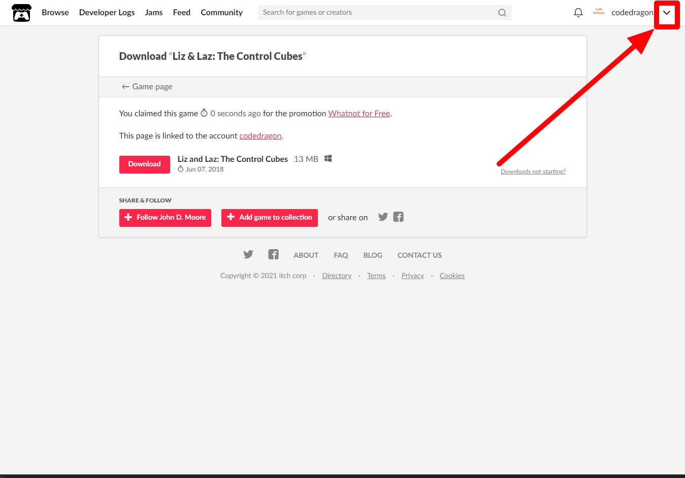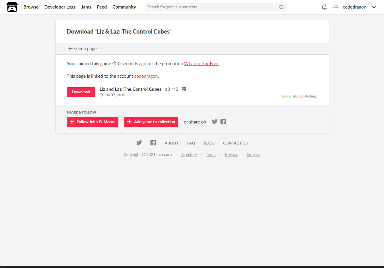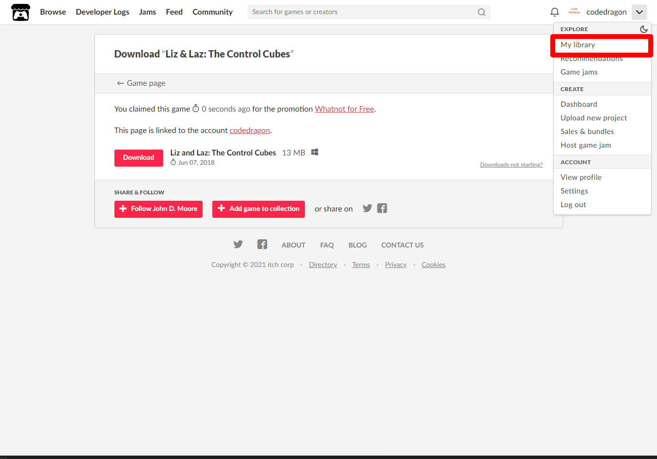 [Claim game]을 클릭하면 나의 게임 라이브러리에 추가되고 설치파일을 다운받을 수 있는 페이지로 이동됩니다.