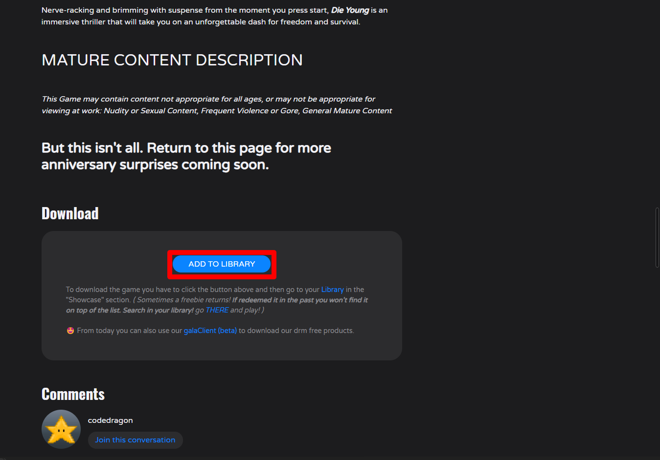 나의 계정의 라이브러리 안에서 "Die Young" 게임 가지고 있는 것 확인할 수 있으며 설치파일도 다운받을 수 있습니다.