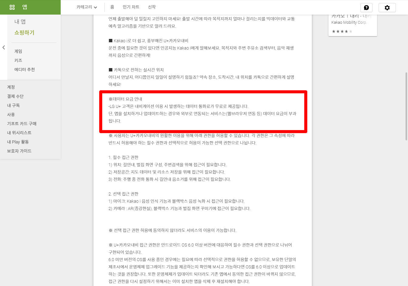 단, 앱을 설치하거나 업데이트하는 경우와 외부로 연동되는 서비스는(웹브라우저 연동 등) 데이터 요금이 부과됩니다.