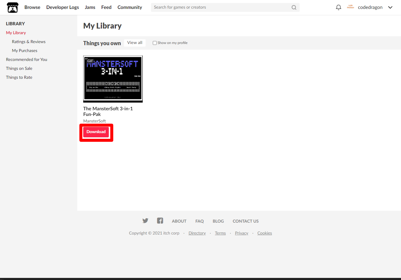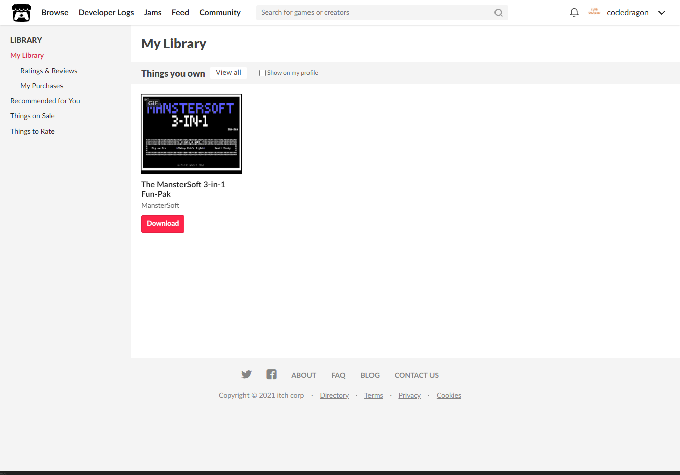 "My Lirary"에서 방금 받은 "The MansterSoft 3-in-1 Fun-Pak" 게임 항목을 확인할 수 있습니다.