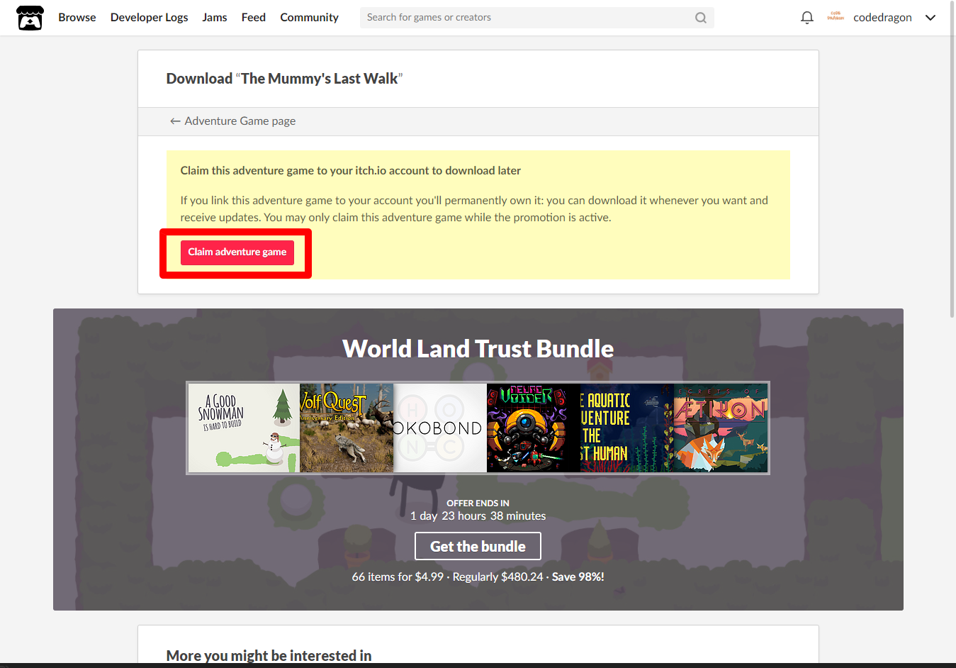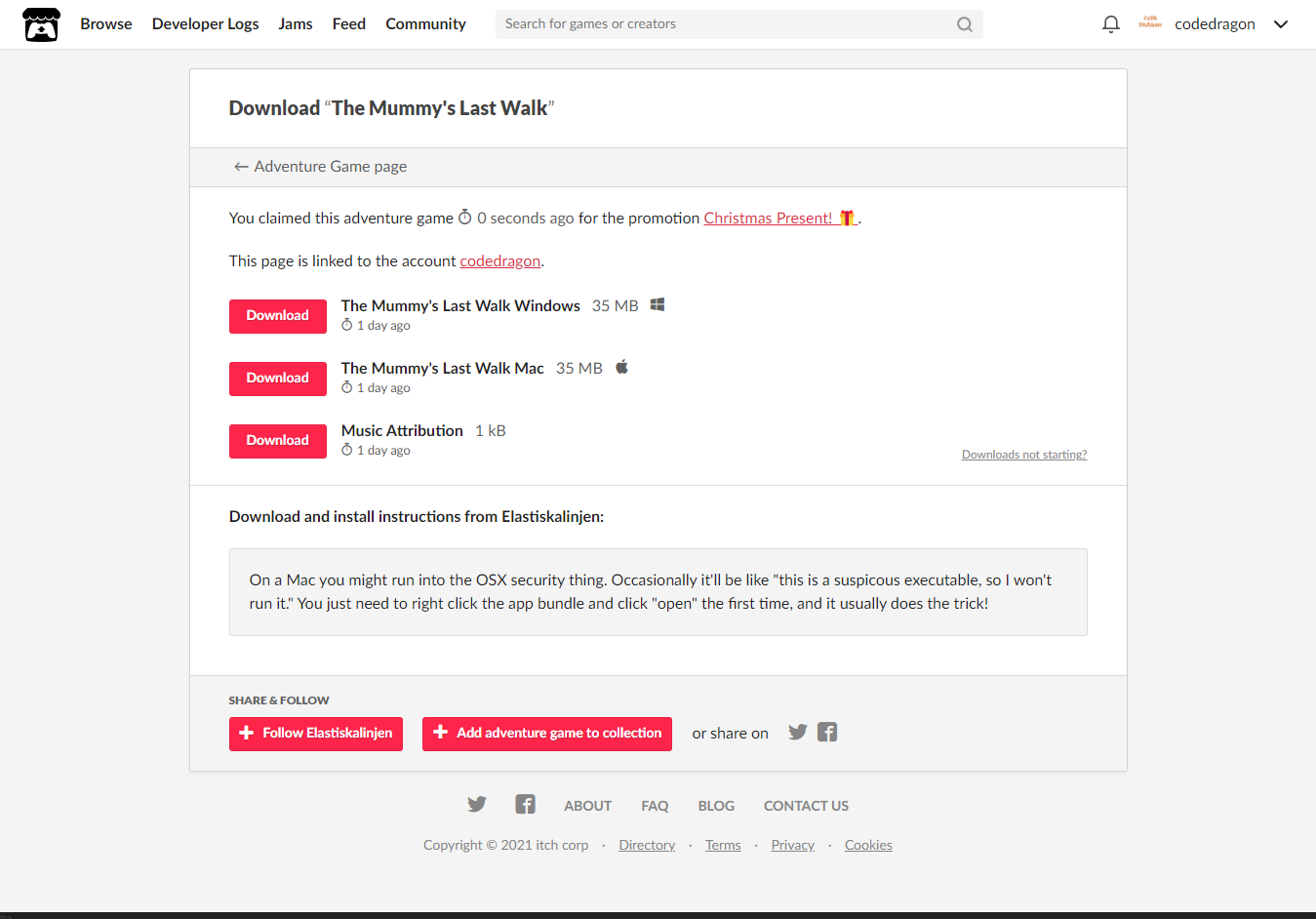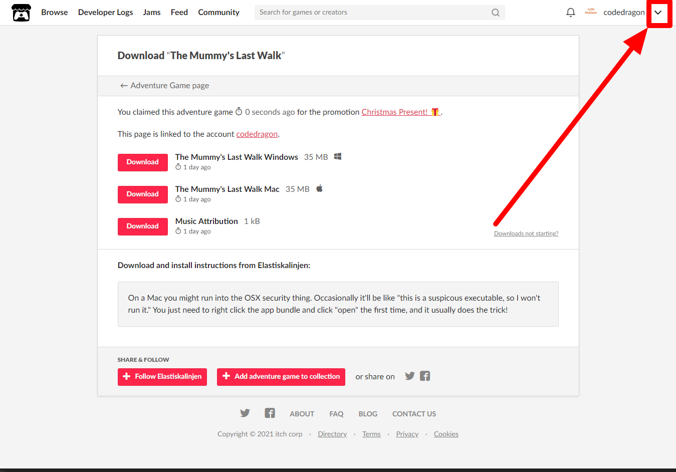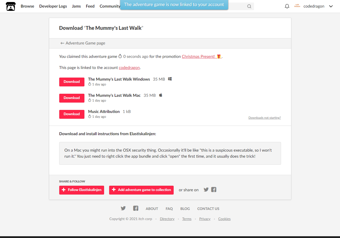 [Claim advanture game]을 클릭하면 나의 게임 라이브러리에 추가되고 설치파일을 다운받을 수 있는 페이지로 이동됩니다.