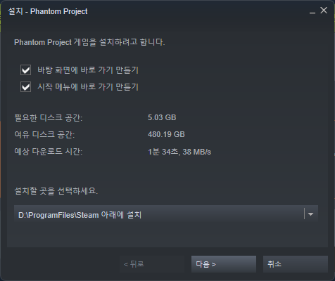 Steam 런처가 실행되면 원하는 위치에 설치를 완료해 줍니다.