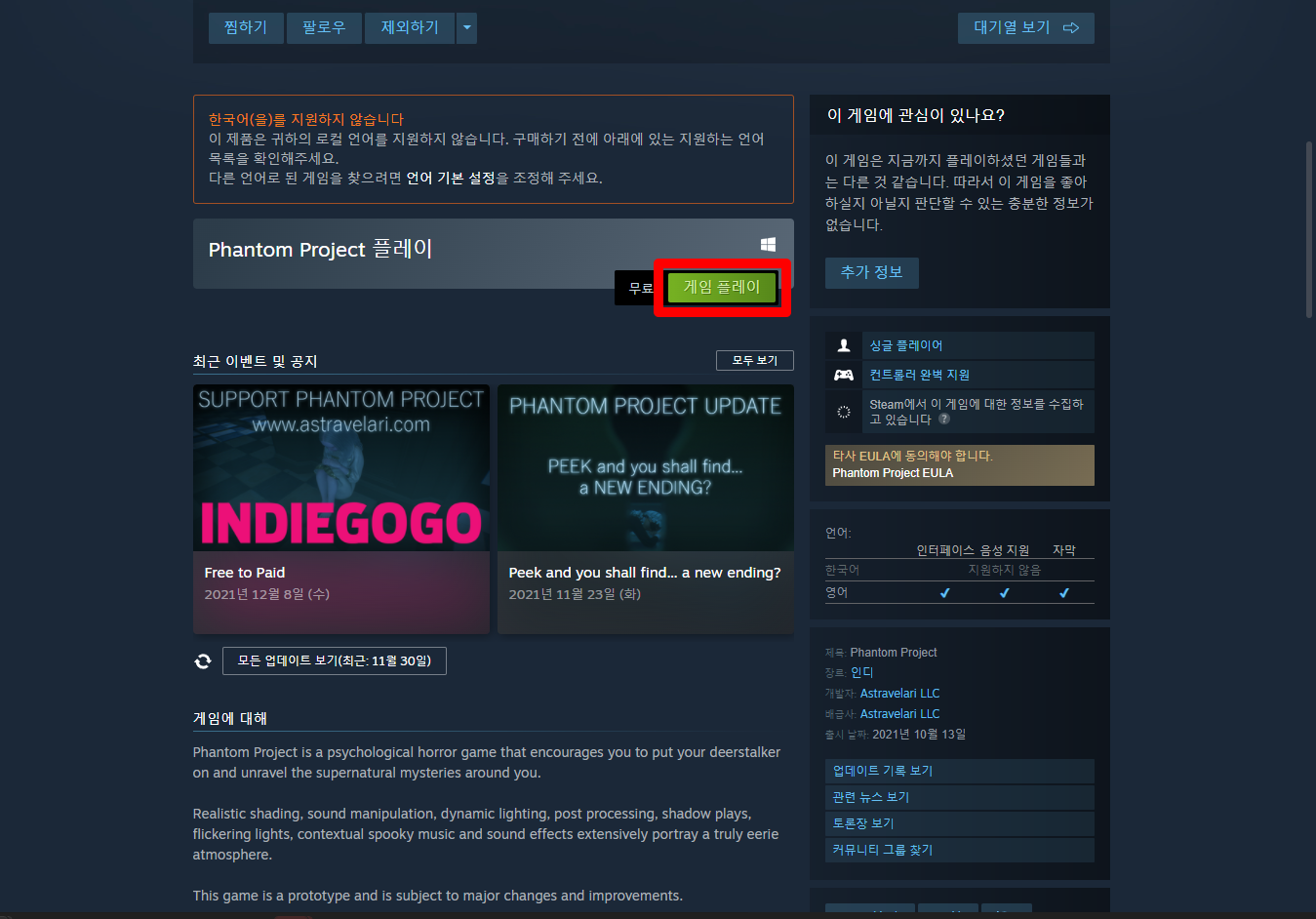 "Phantom Project" 페이지를 내려 [게임 플레이]를 클릭하면 됩니다.