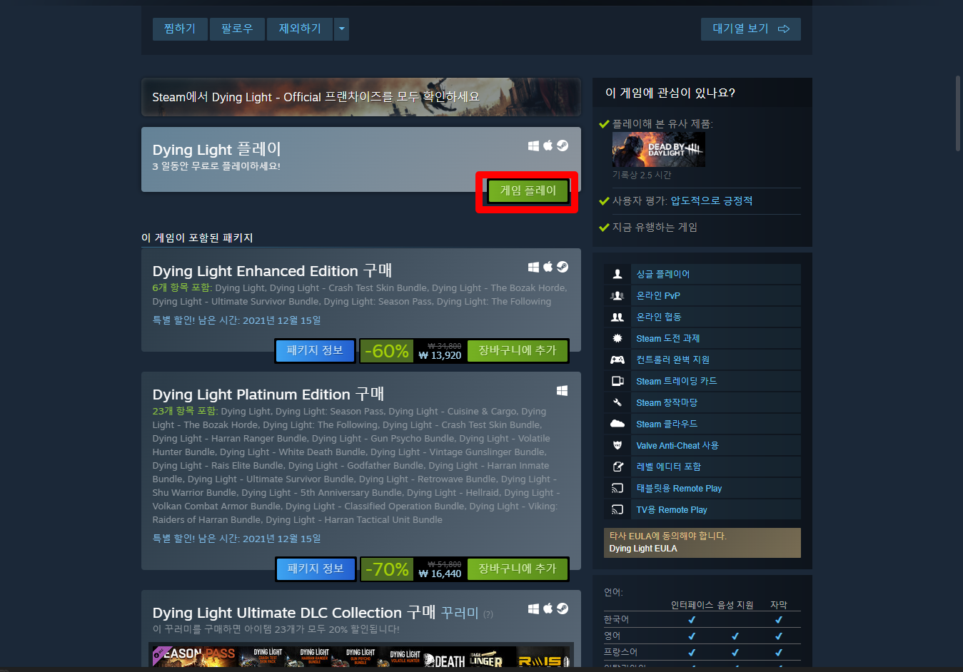 "Dying Light" 게임페이지를 조금 내려서 [게임 플레이] 버튼을 클릭하면 됩니다.