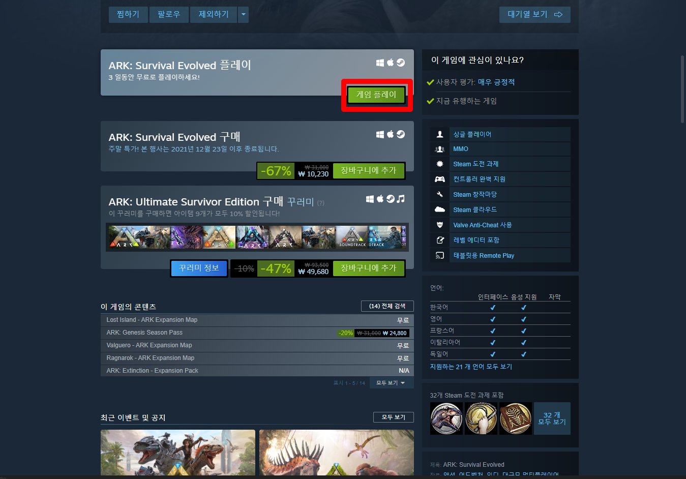 "ARK: Survival Evolved" 게임페이지를 조금 내려서 [게임 플레이] 버튼을 클릭하면 됩니다.