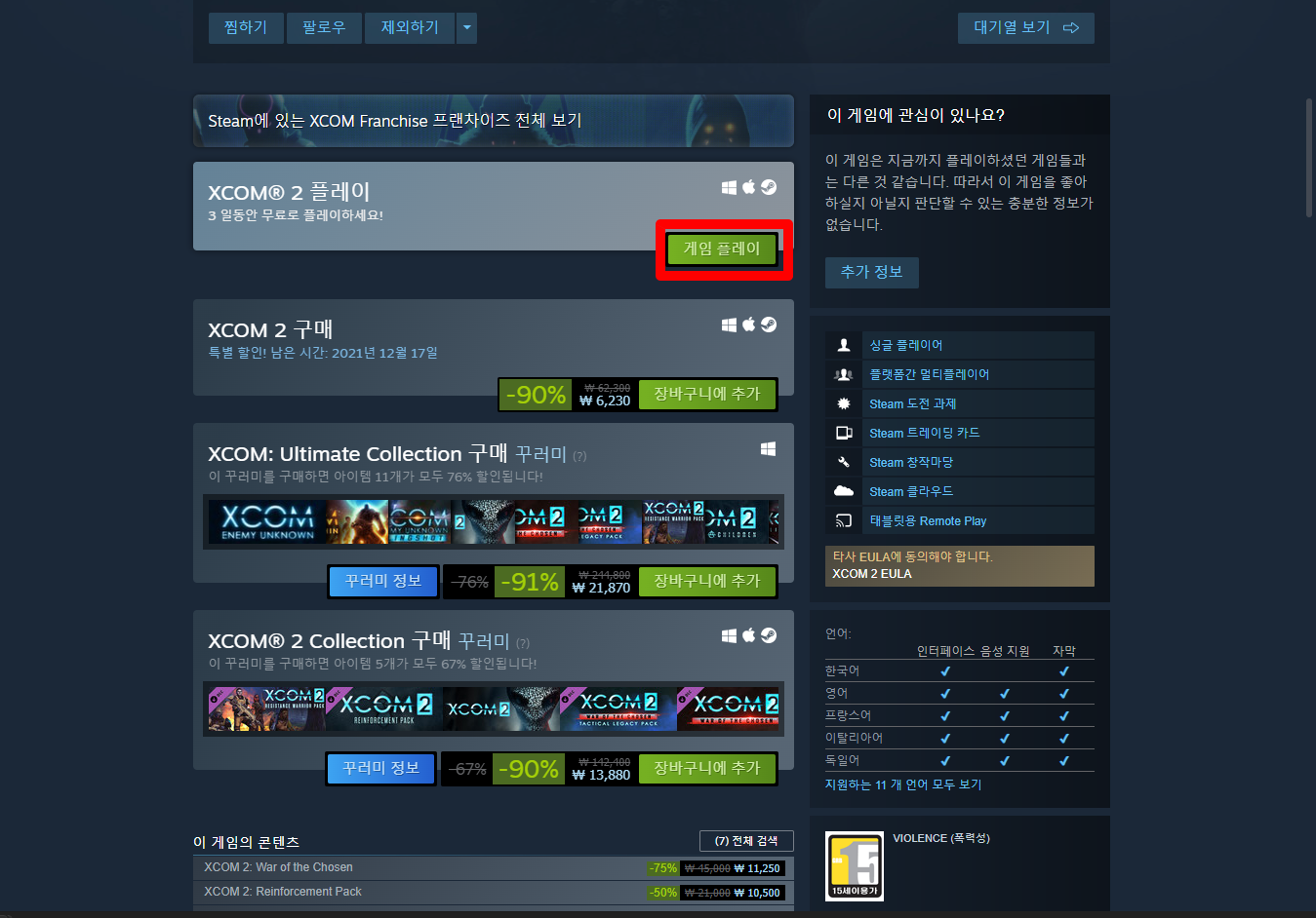 "XCOM® 2" 게임페이지를 조금 내려서 [게임 플레이] 버튼을 클릭하면 됩니다.