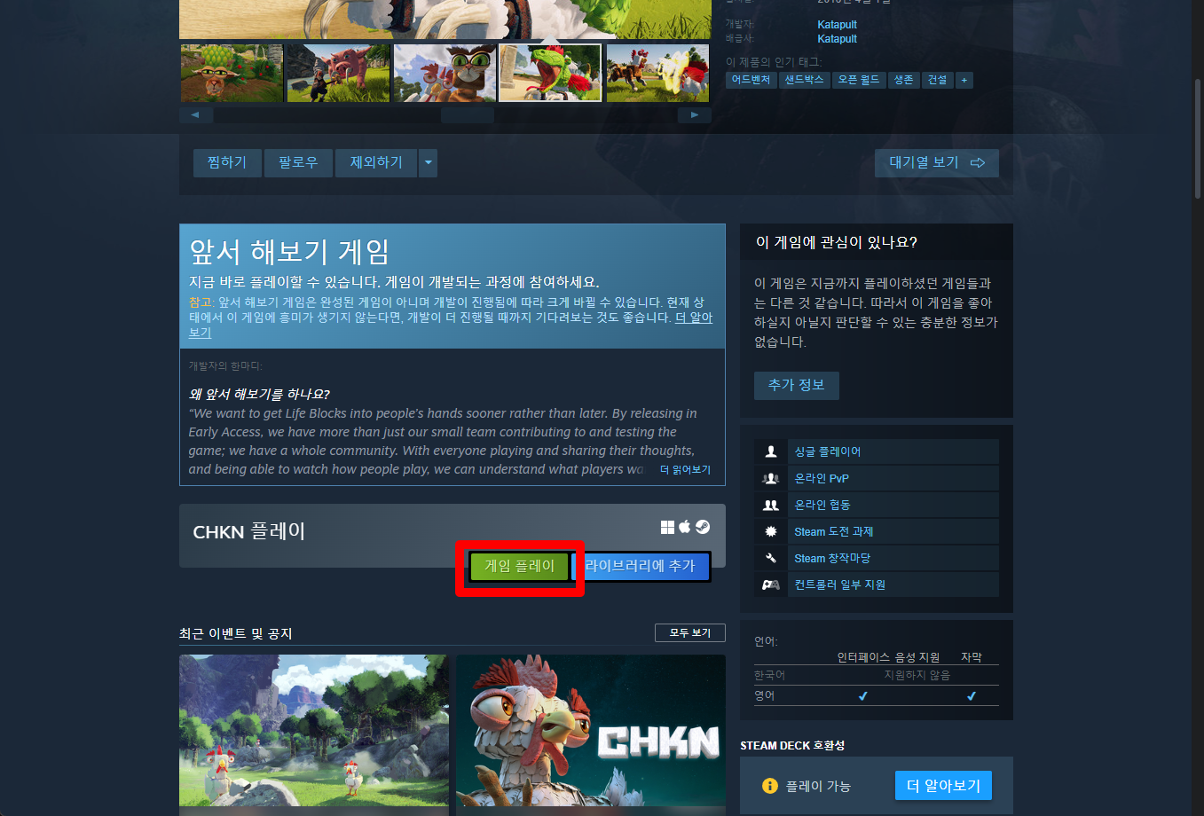 "CHKN" 페이지를 내려 [게임 플레이]를 클릭하면 됩니다.