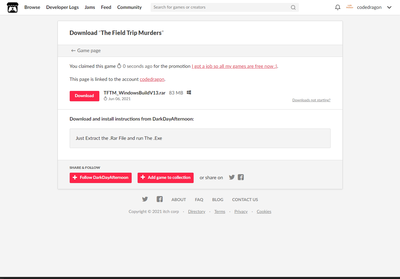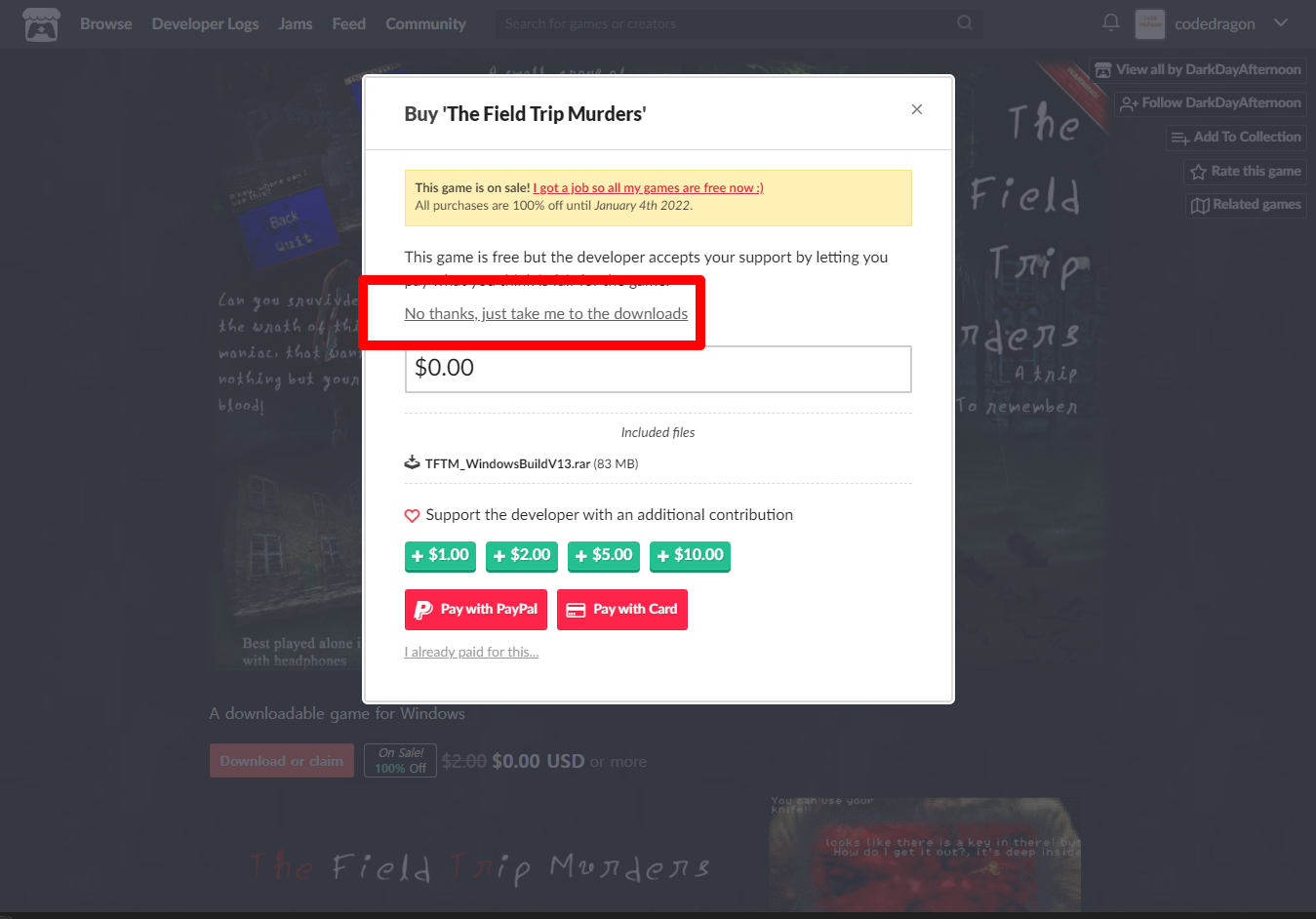 "The Field Trip Murders" 해당 항목에 있는 [Download] 버튼을 클릭하면 게임의 설치파일을 다운받을 수 있습니다.
