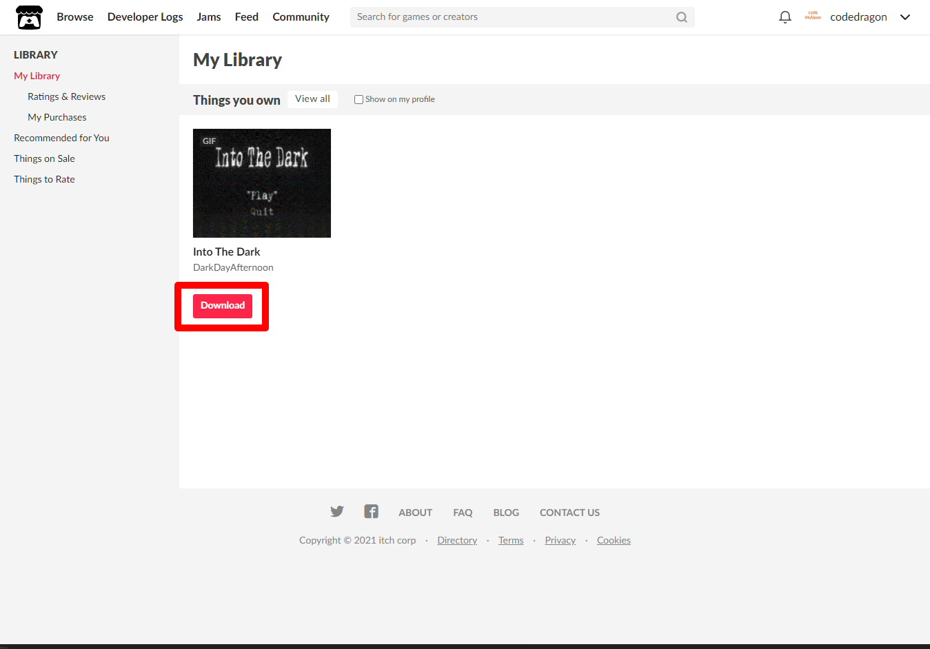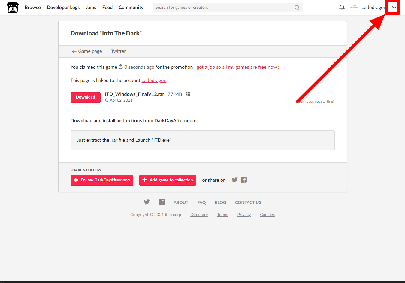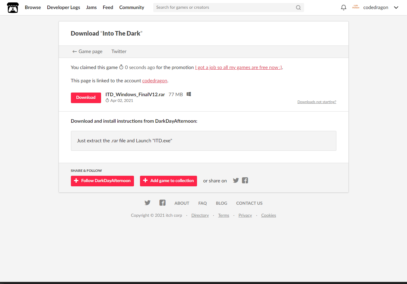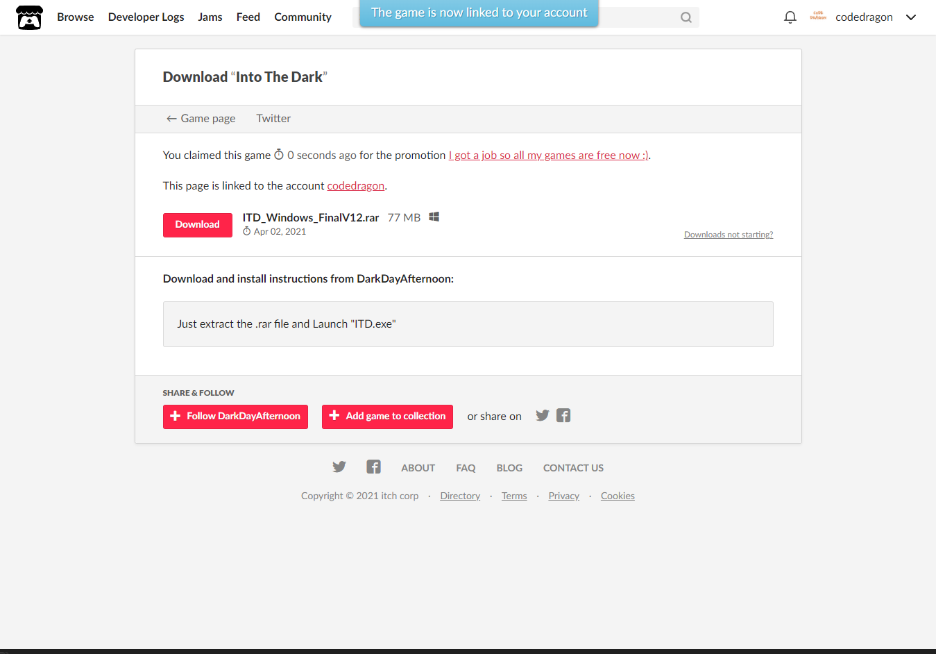 "Into The Dark" 해당 항목에 있는 [Download] 버튼을 클릭하면 게임의 설치파일을 다운받을 수 있습니다.