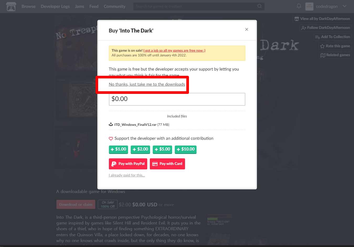 "Into The Dark" 해당 항목에 있는 [Download] 버튼을 클릭하면 게임의 설치파일을 다운받을 수 있습니다.