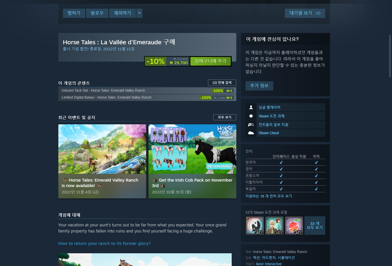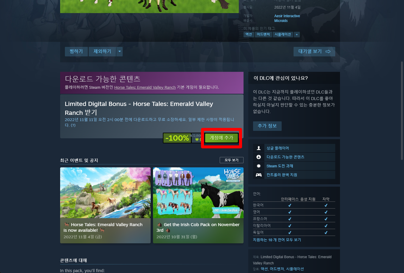 "Limited Digital Bonus - Horse Tales Emerald Valley Ranch" 게임페이지를 조금 내려준 후 [계정에 추가] 버튼을 클릭하면 게임라이브러리에 추가됩니다.