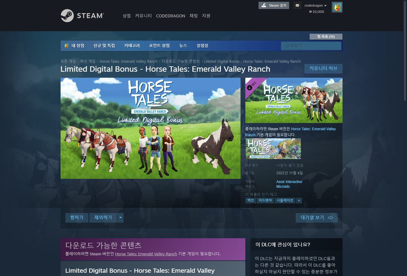 "Limited Digital Bonus - Horse Tales Emerald Valley Ranch" DLC 게임페이지에 접속합니다.
