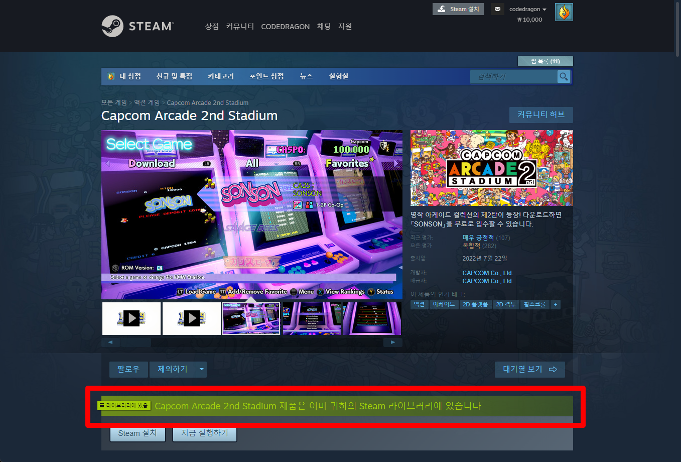 "Capcom Arcade 2nd Stadium" 게임정보 페이지를 보면 녹색으로 "라이브러리에 있음"으로 표시되어 있어 내가 소장하고 있는 게임인 것이 확인됩니다.