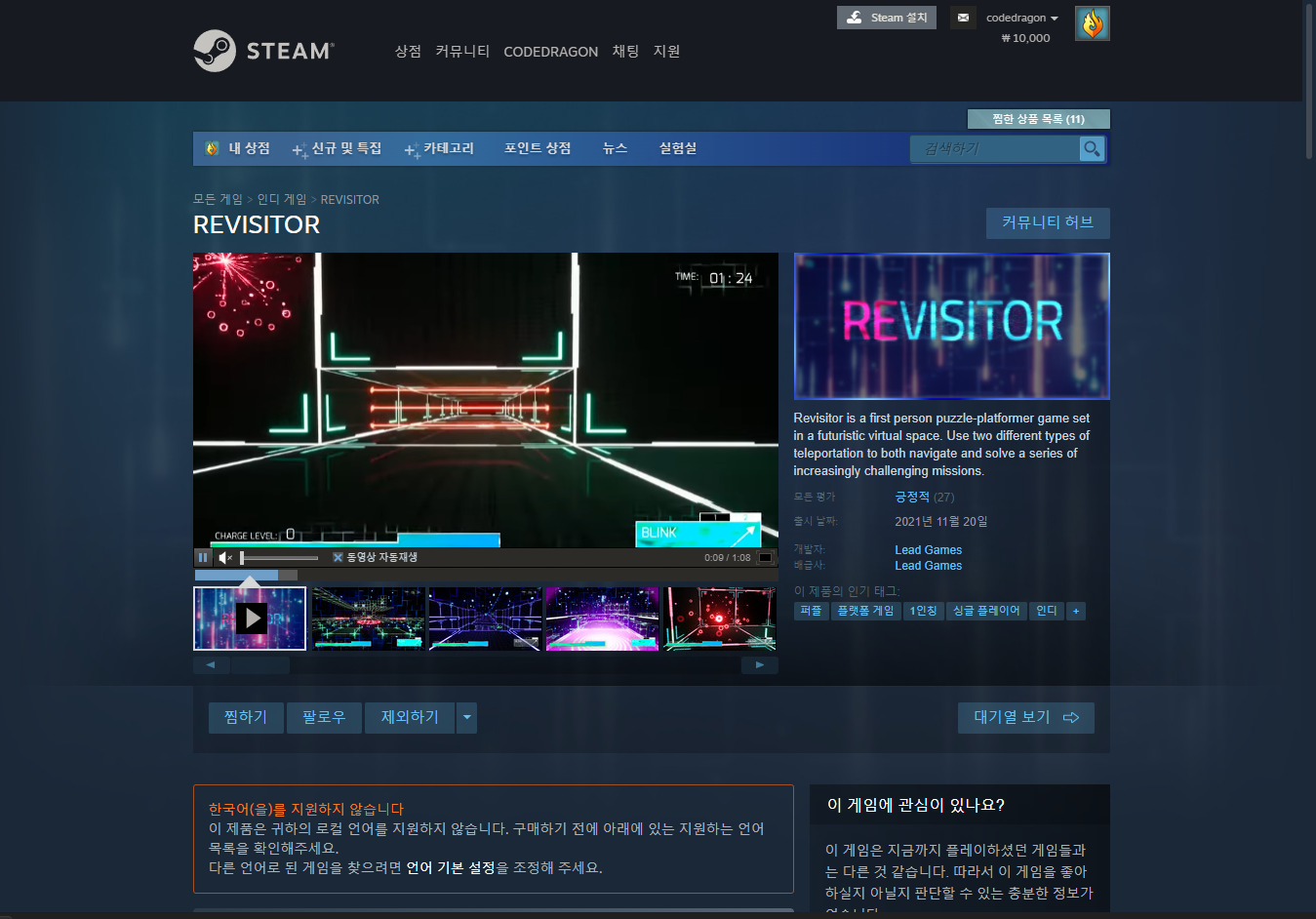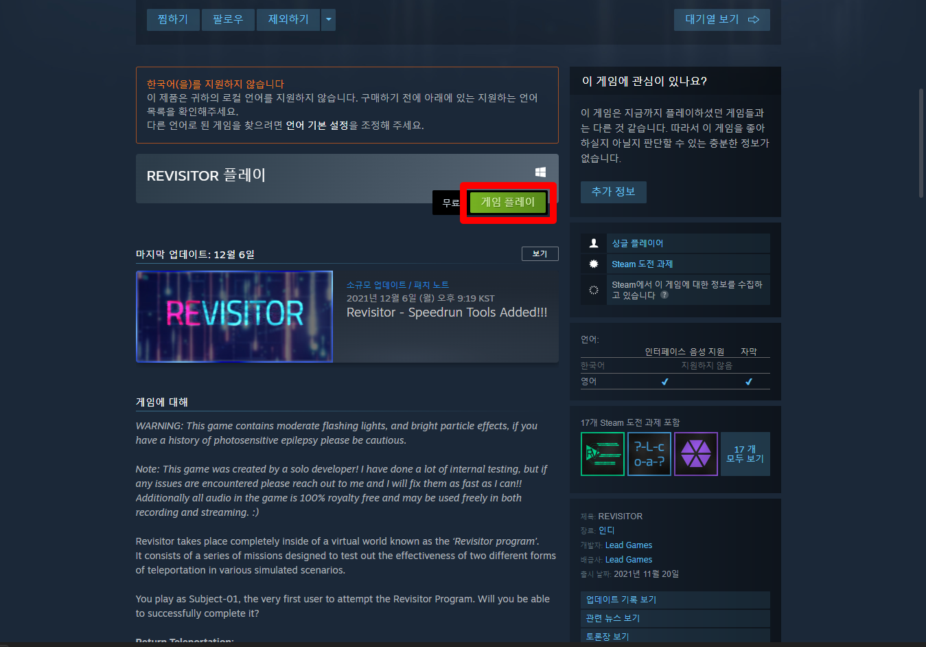 "REVISITOR" 페이지를 내려 [게임 플레이]를 클릭하면 됩니다.