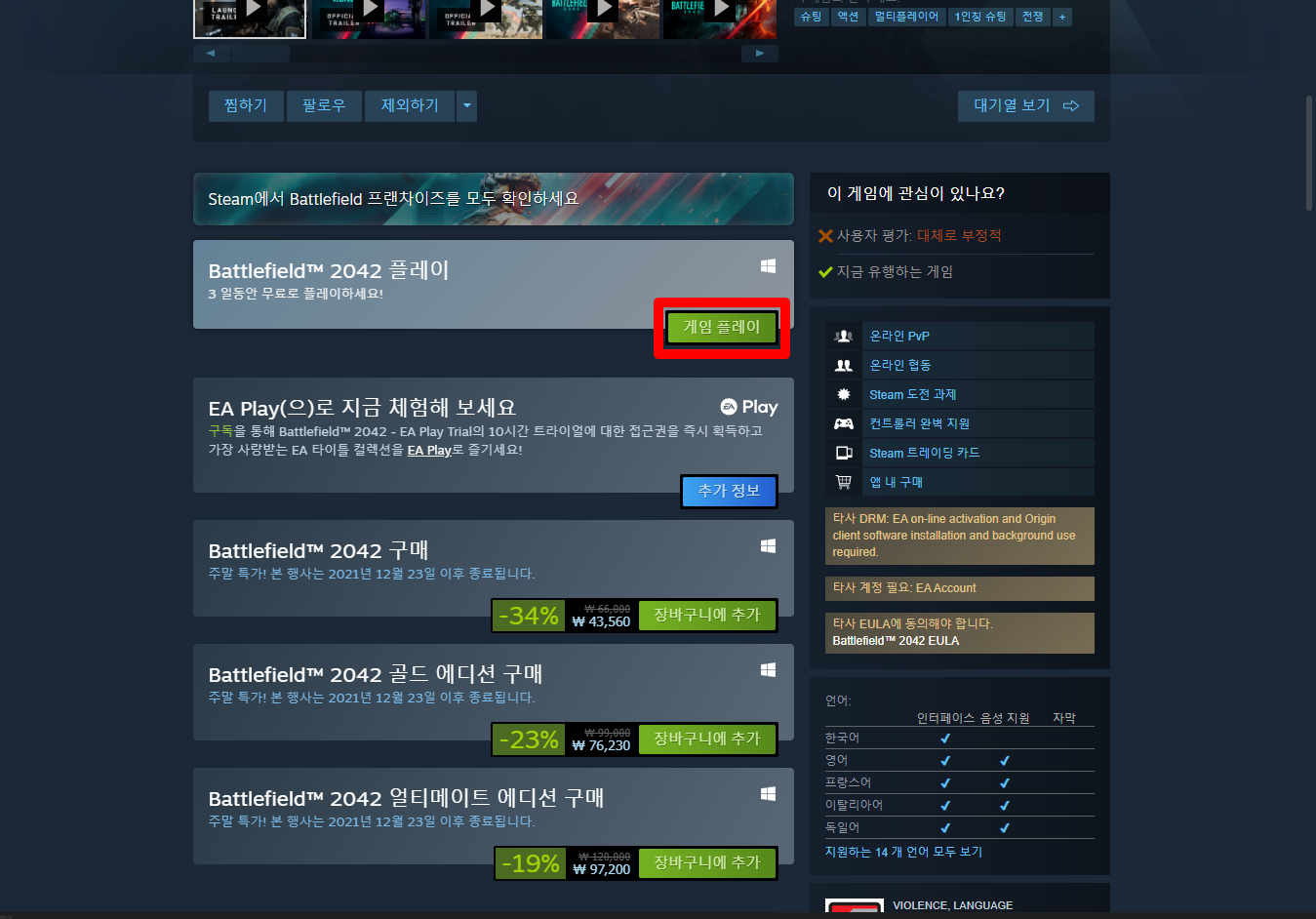 "Battlefield 2042" 게임페이지를 조금 내려서 [게임 플레이] 버튼을 클릭하면 됩니다.